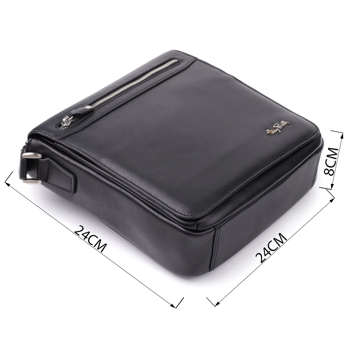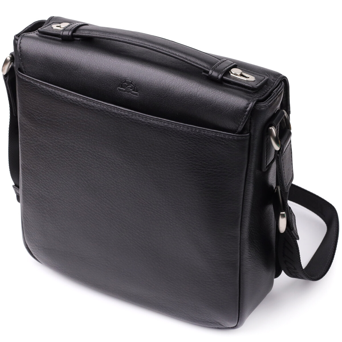 Сумка виготовлена з натуральної зернистої шкіри чорного кольору. Оснащена одним основним відділенням, яке закривається клапаном на два магніти. Усередині розташована додаткова кишеня, дві осередки для ручок і потайна кишеня на блискавці. Зовні – кишеня на блискавці на клапані, а також кишеня на блискавці на тильній стороні. Доповнена міцним брендованим текстильним ременем, який робить використання зручним та підкреслює оригінальність виробу.
