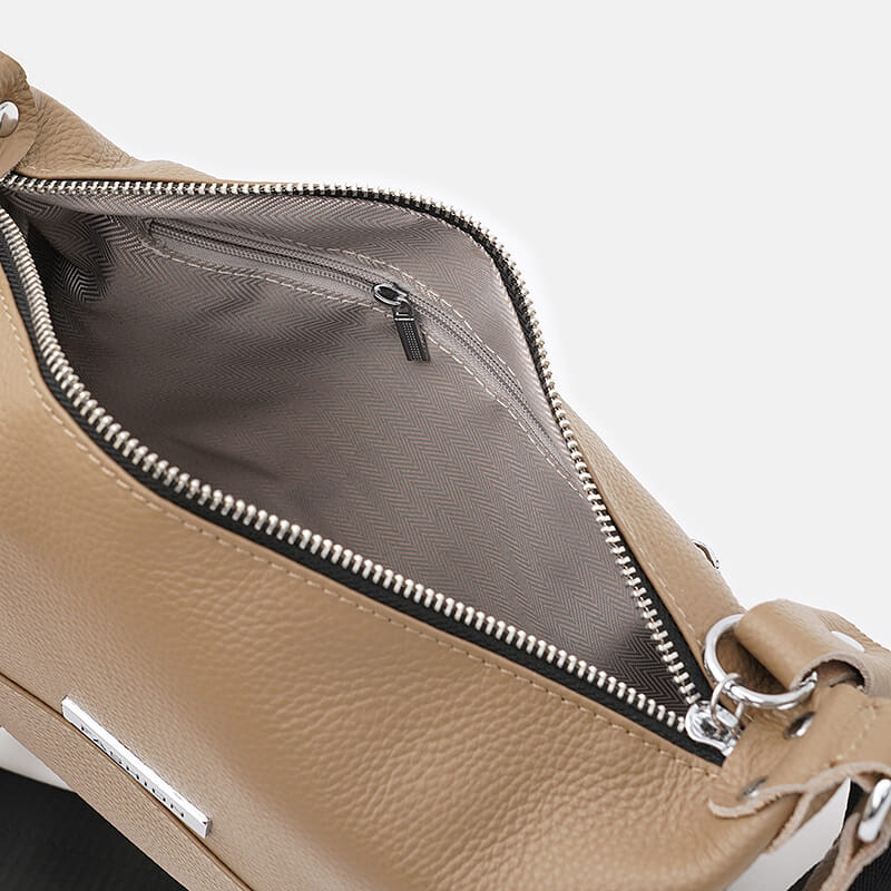 Жіноча шкіряна сумка має 1 основне відділення на блискавці, всередині – 2 кишені для телефону та інших дрібниць. З тильного боку-1 кишеня на блискавці. Текстиль підкладки. Незнімний текстильний ремінь регулюється довжиною.