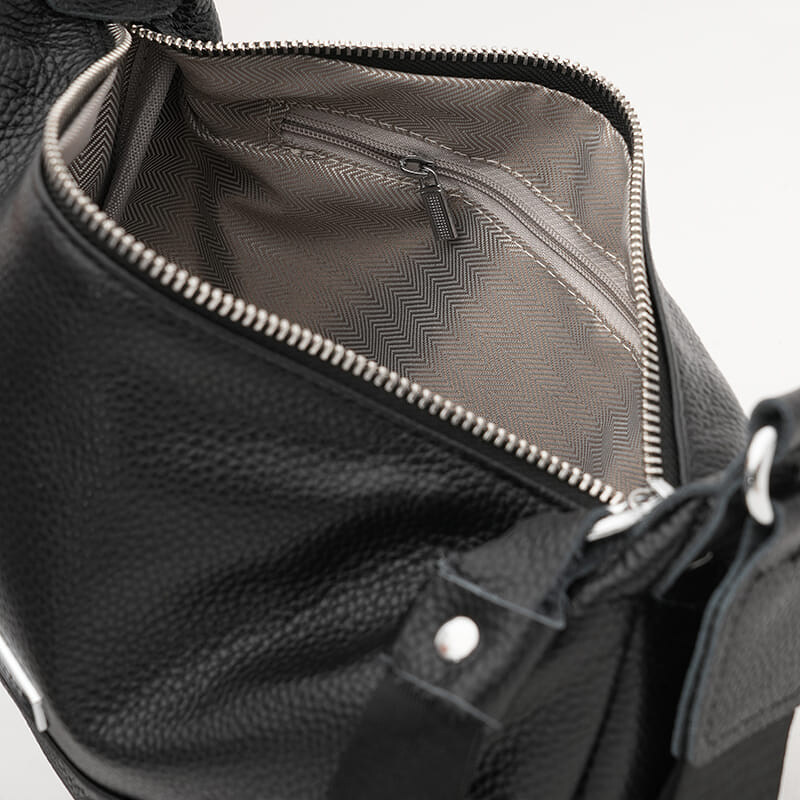 Жіноча шкіряна сумка має 1 основне відділення на блискавці, всередині – 2 кишені для телефону та інших дрібниць. З тильного боку-1 кишеня на блискавці. Підкладка текстилю. Несъемный текстильний ремінь регулюється по довжині.