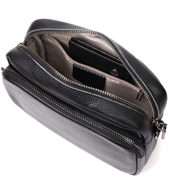 Практична жіноча сумка з накладною кишенею на лицьовій стороні. Виріб пошитий з якісної натуральної шкіри, яка довго носиться і не втрачає свого первісного вигляду. Аксесуар складається з одного основного відділення всередині якого розташована кишеня відкритого типу і кишеня на блискавці, також зовні розташована кишеня на блискавці, на тильній стороні та накладна кишеня на блискавці, на лицьовій стороні. Носити сумку можна в руці як клатч, на плечі та через плече, для цього є текстильний ремінь, що знімається. У виробі використано якісну фурнітуру кольору темного срібла. Універсальний варіант сумки як на вечір так і як сумочка на кожен день.