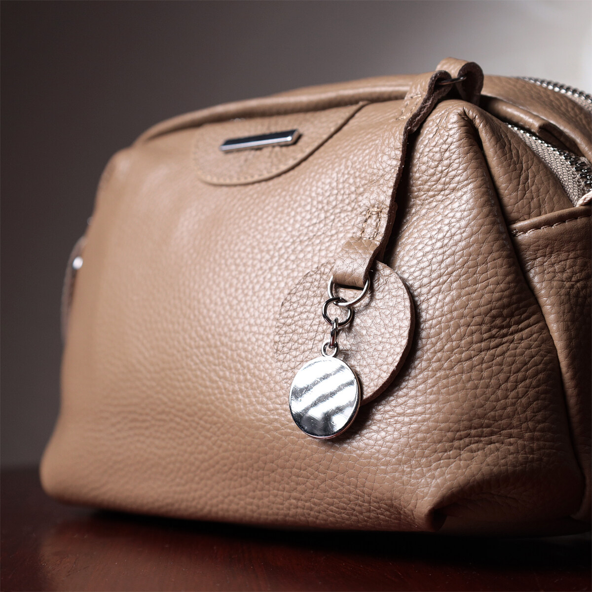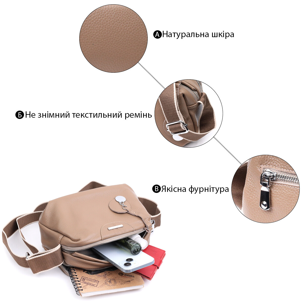 Жіноча сумка з натуральної шкіри флотар, яка має зернисту фактуру. У виробі використано шкіру бежевого кольору. Аксесуар складається з двох відділень, які закриваються на блискавки, потайної кишені на блискавці та кишені відкритого типу, а також кишені зовні на тильній стороні. Виріб має тверде дно, що дозволяє зберігати форму. Носити сумку можна в руці, під рукою, на плечі і через плече, для цього є текстильний ремінь, що не знімається. В аксесуарі використано якісну фурнітуру кольору срібла. Відмінний варіант для подарунка близьким та дорогим дівчатам та жінкам.