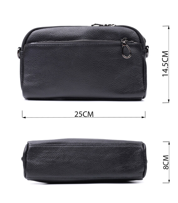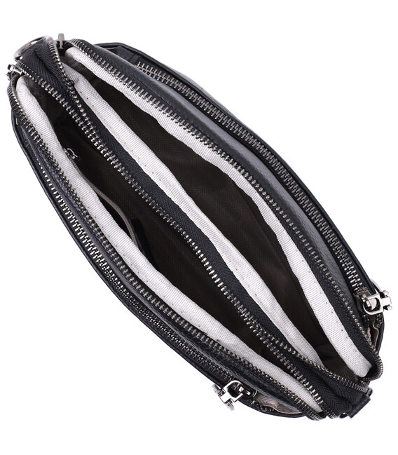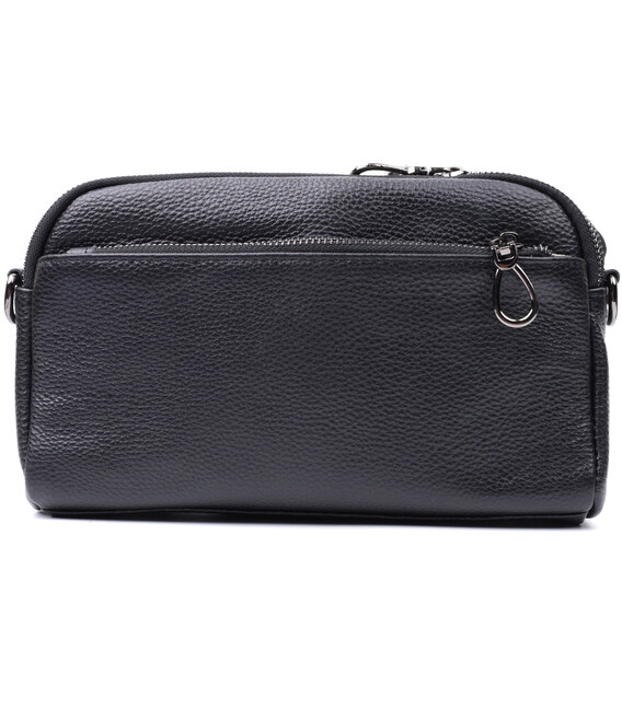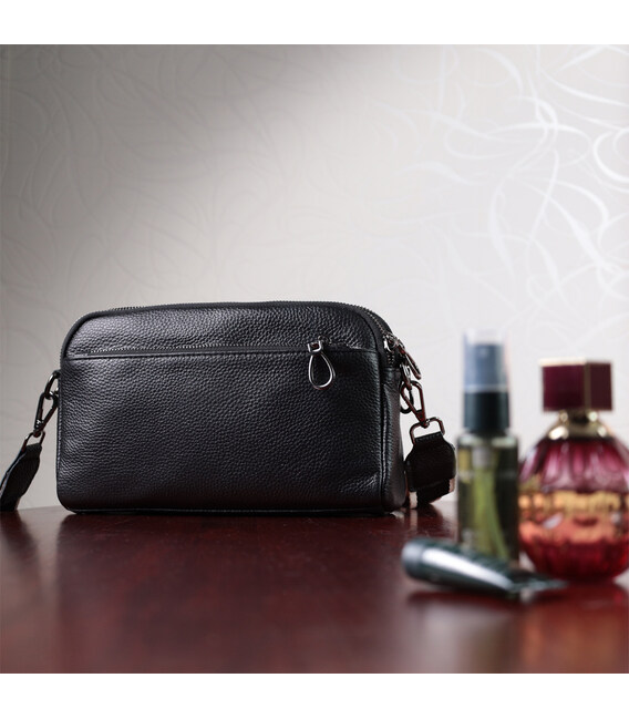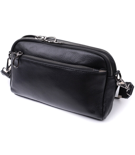 Зручна жіноча сумка на всі випадки із натуральної шкіри флотар, яка має зернисту фактуру. У виробі використано шкіру чорного кольору. Аксесуар складається з двох відділень, які закриваються на блискавці, потайної кишені на блискавці та кишені відкритого типу, а також двох кишень зовні на лицьовій та тильній стороні. Носити сумку можна в руці, під рукою, на плечі і через плече, для цього є текстильний ремінь, що знімається. В аксесуарі використано якісну фурнітуру кольору темного срібла. Відмінний варіант для подарунка близьким та дорогим дівчатам та жінкам.