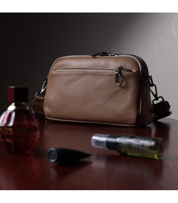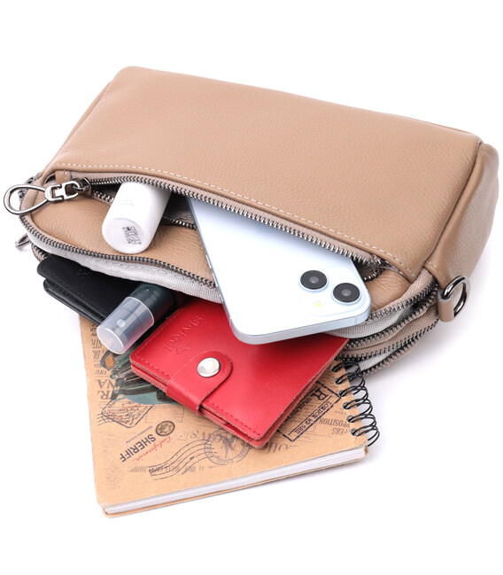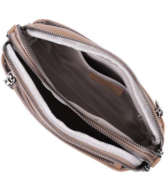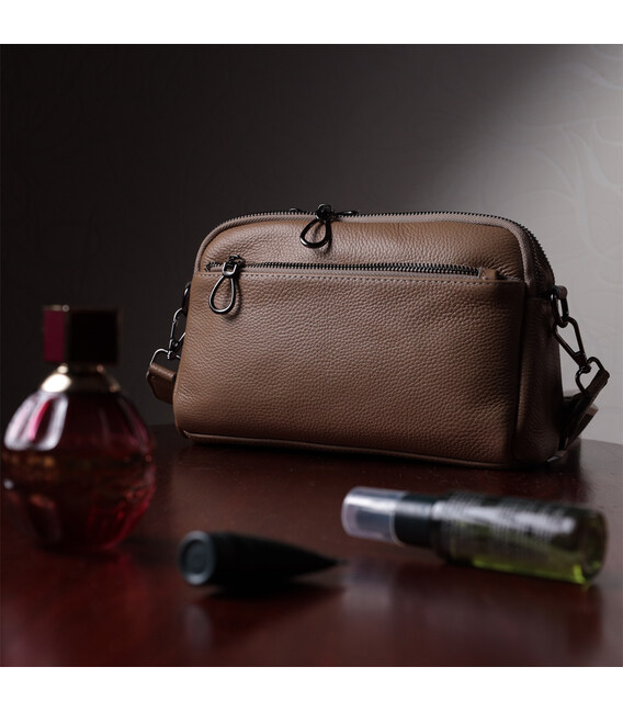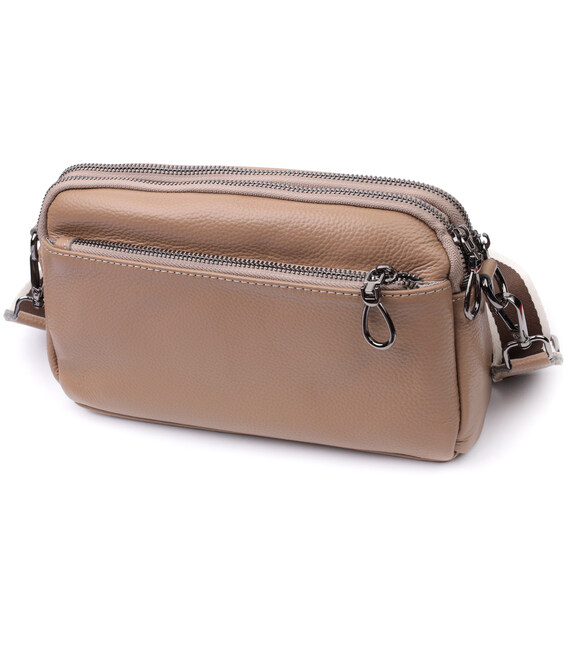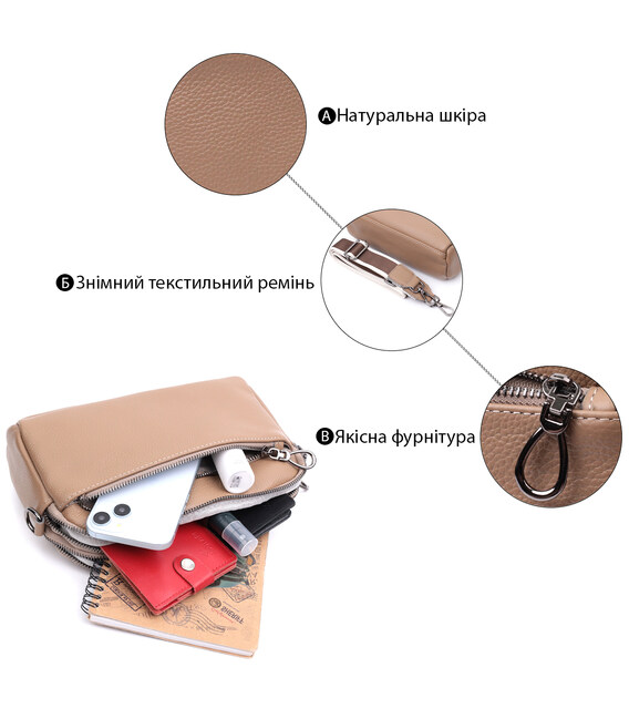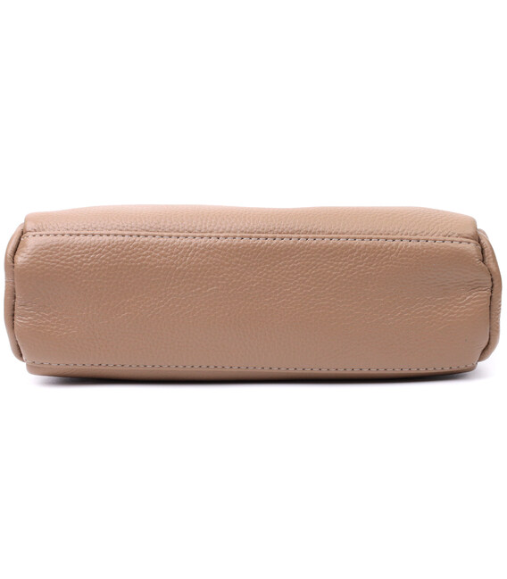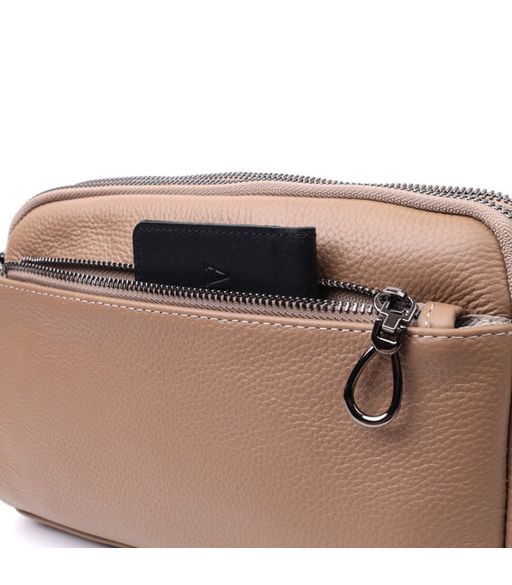Стильна сумка жіноча на всі випадки з натуральної шкіри флотар, яка має зернисту фактуру. У виробі використано шкіру бежевого кольору. Аксесуар складається з двох відділень, які закриваються на блискавці, потайної кишені на блискавці та кишені відкритого типу, а також двох кишень зовні на лицьовій та тильній стороні. Носити сумку можна в руці, під рукою, на плечі і через плече, для цього є текстильний ремінь, що знімається. В аксесуарі використано якісну фурнітуру кольору темного срібла. Відмінний варіант для подарунка близьким та дорогим дівчатам та жінкам.