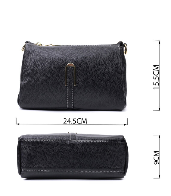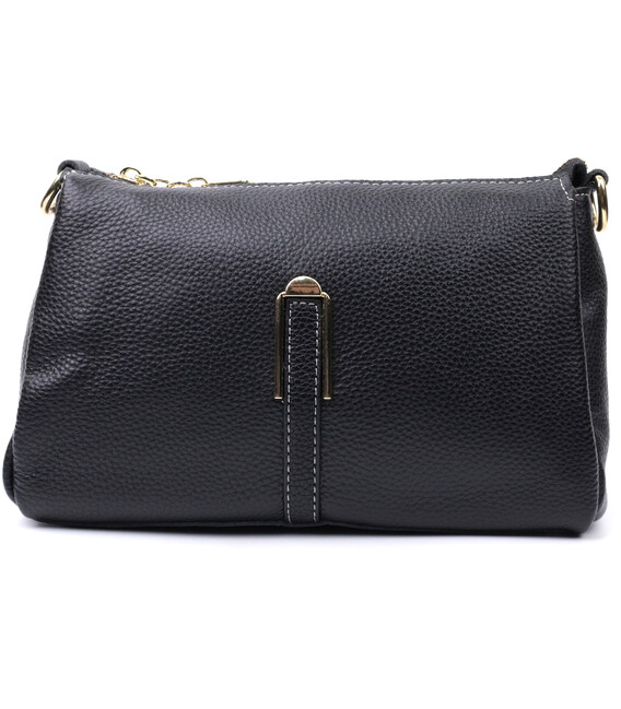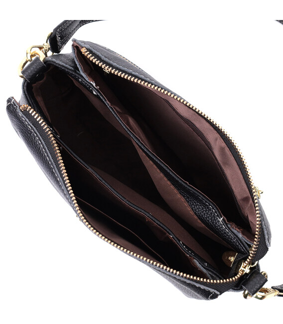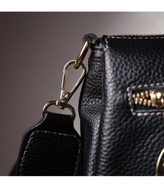 Елегантна жіноча сумка на всі випадки життя із натуральної якісної шкіри. Аксесуар складається з основного відділення, яке закривається на блискавку, кишені на блискавці та трьох кишень відкритого типу всередині, а також кишені на блискавці зовні на задній стороні. Носити сумку можна в руці, під рукою, на плечі і через плече, для цього є три ремінці різної довжини, два шкіряні та один текстильний. В аксесуарі використано якісну фурнітуру кольору жовтого золота.