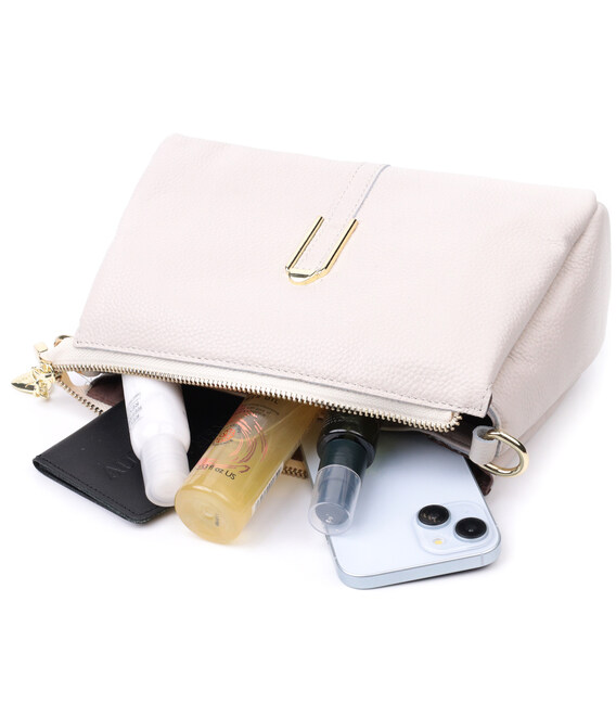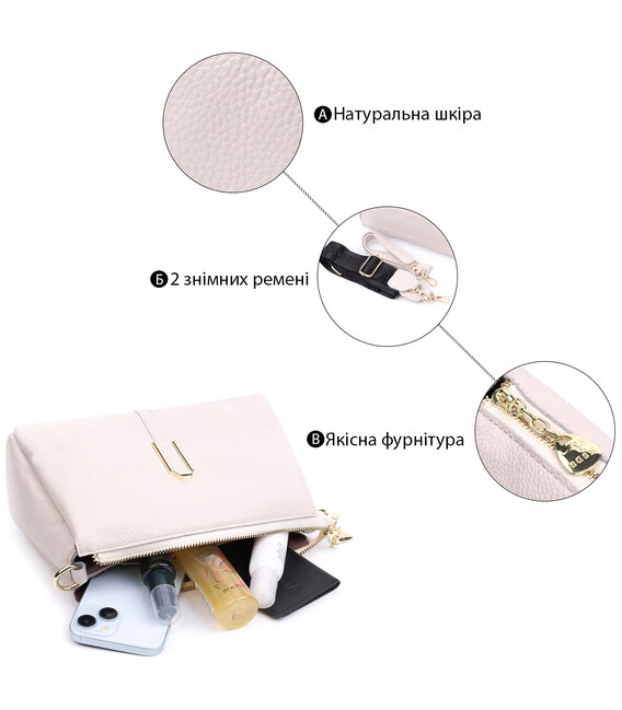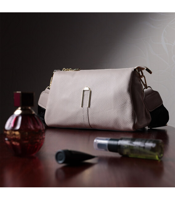 Зручна жіноча сумка на всі випадки життя із натуральної якісної шкіри. Аксесуар складається з основного відділення, яке закривається на блискавку, кишені на блискавці та трьох кишень відкритого типу всередині, а також кишені на блискавці зовні на задній стороні. Носити сумку можна в руці, під рукою, на плечі і через плече, для цього є три ремінці різної довжини, два шкіряні та один текстильний. В аксесуарі використано якісну фурнітуру кольору жовтого золота.