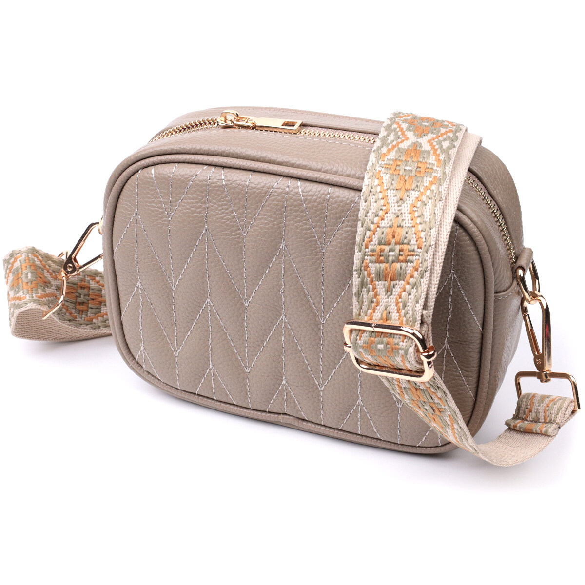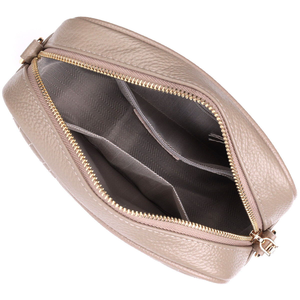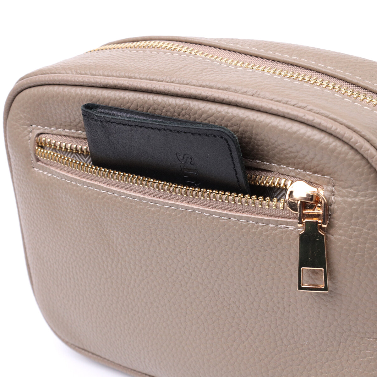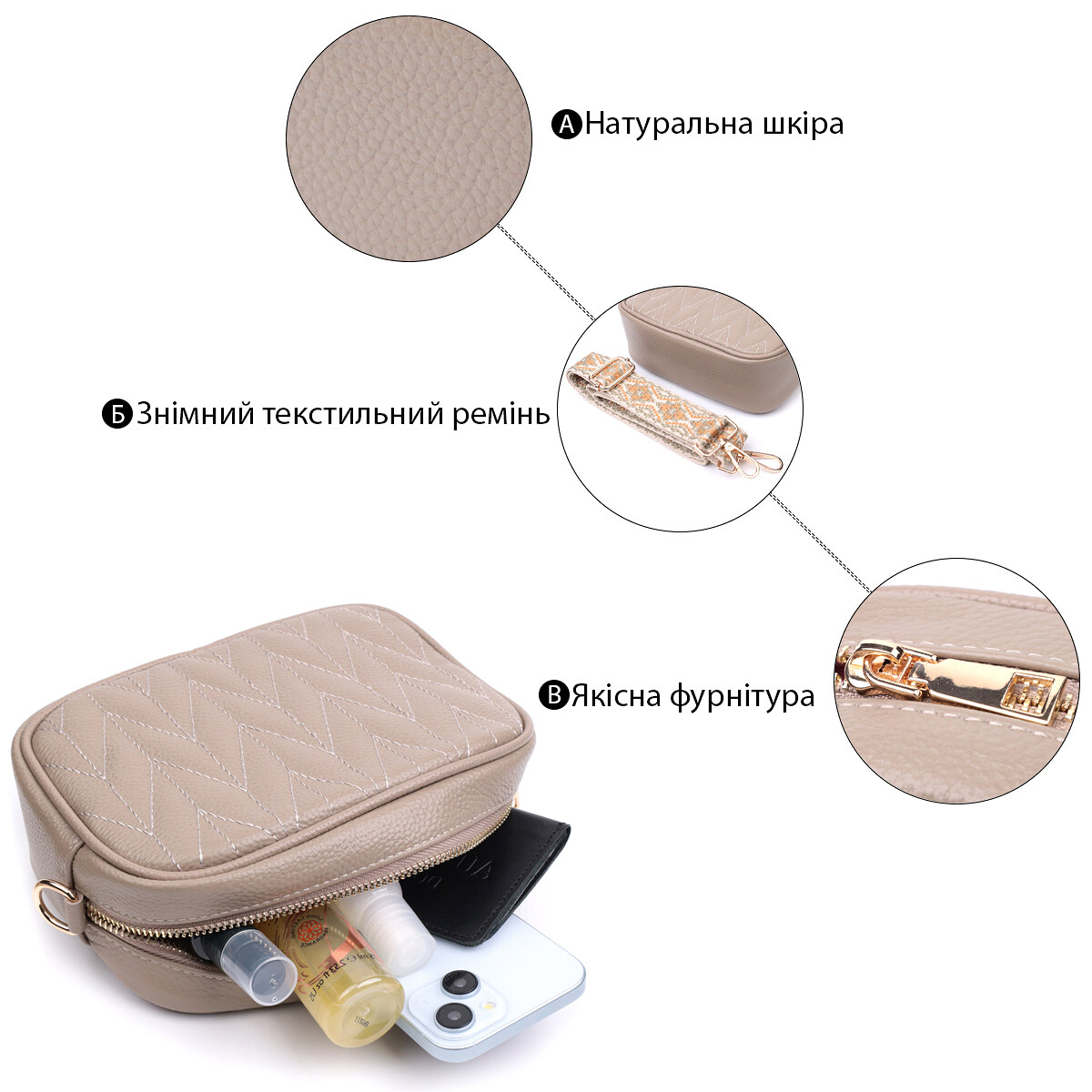 Зручна сумка для жінок на всі випадки життя із натуральної якісної шкіри. Аксесуар складається з основного відділення, яке закривається на блискавку, кишені відкритого типу всередині, а також кишені на блискавці зовні на задній стороні. Носити сумку можна в руці, під рукою, на плечі і через плече, для цього є текстильний ремінь, що знімається. В аксесуарі використано якісну фурнітуру кольору золота.