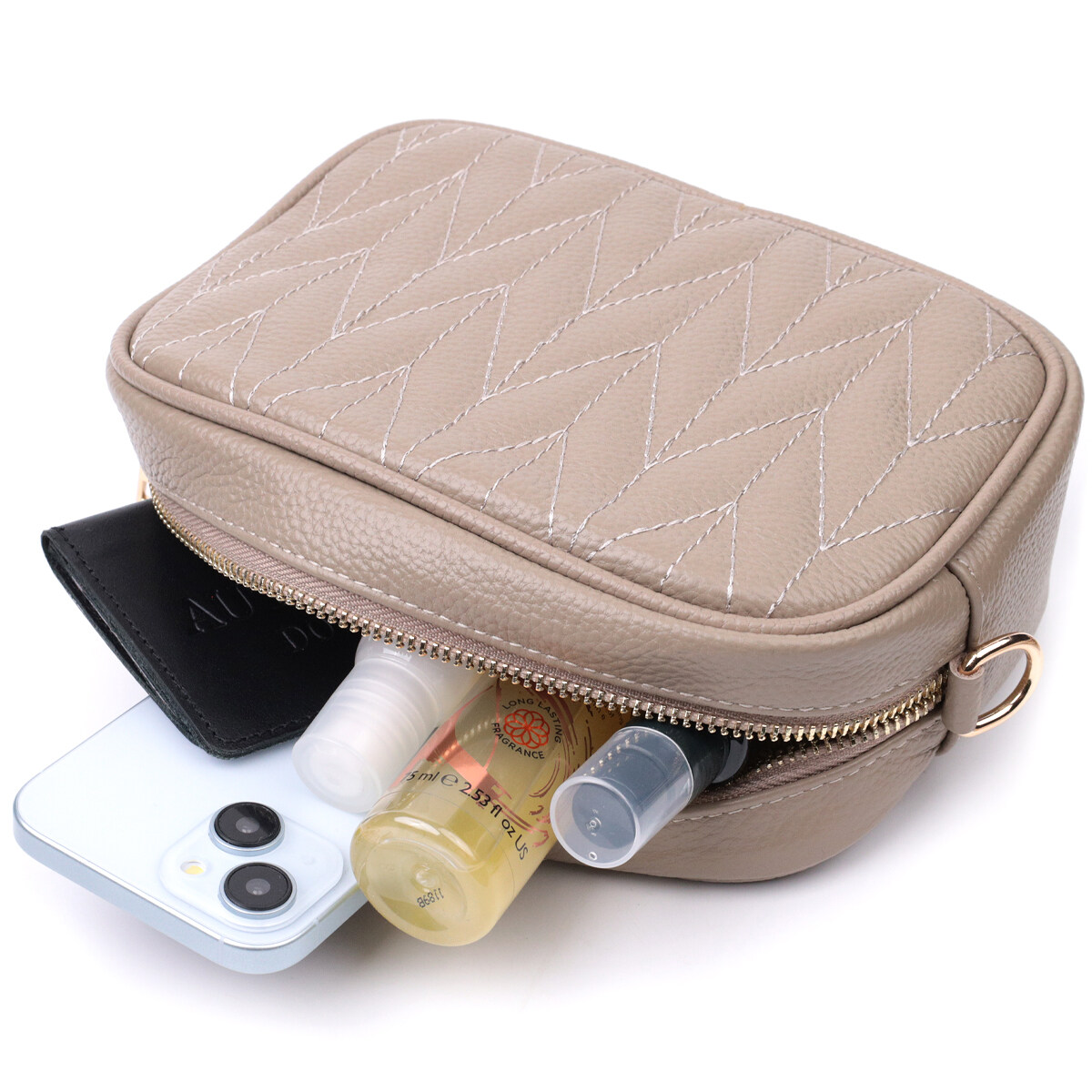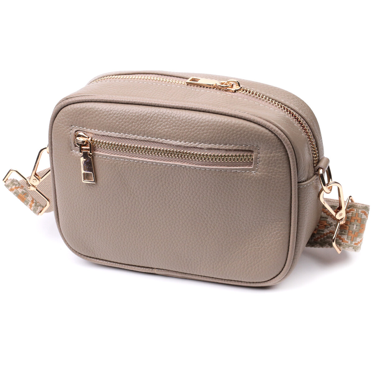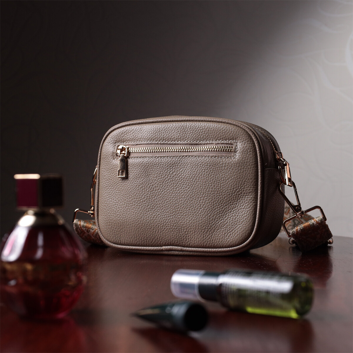 Зручна сумка для жінок на всі випадки життя із натуральної якісної шкіри. Аксесуар складається з основного відділення, яке закривається на блискавку, кишені відкритого типу всередині, а також кишені на блискавці зовні на задній стороні. Носити сумку можна в руці, під рукою, на плечі і через плече, для цього є текстильний ремінь, що знімається. В аксесуарі використано якісну фурнітуру кольору золота.