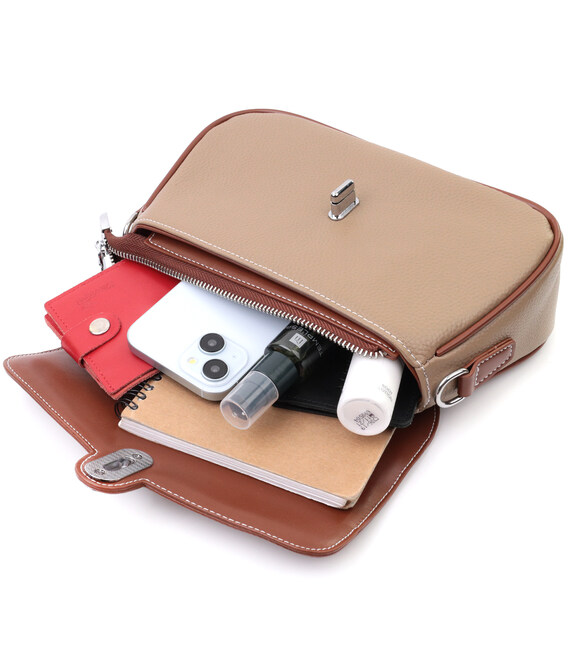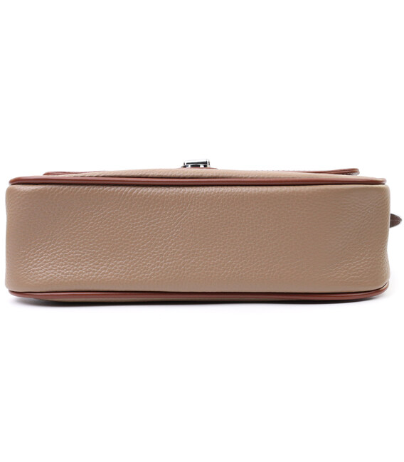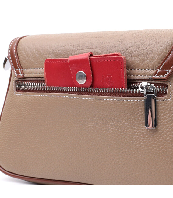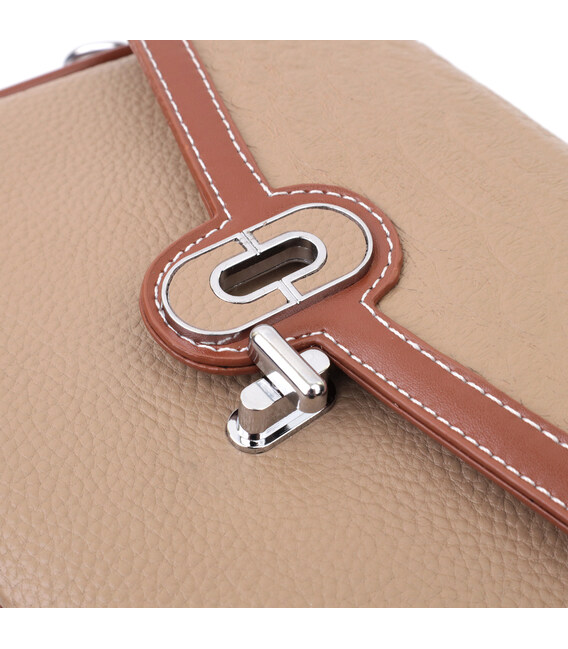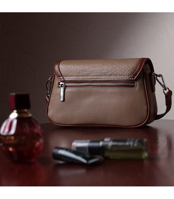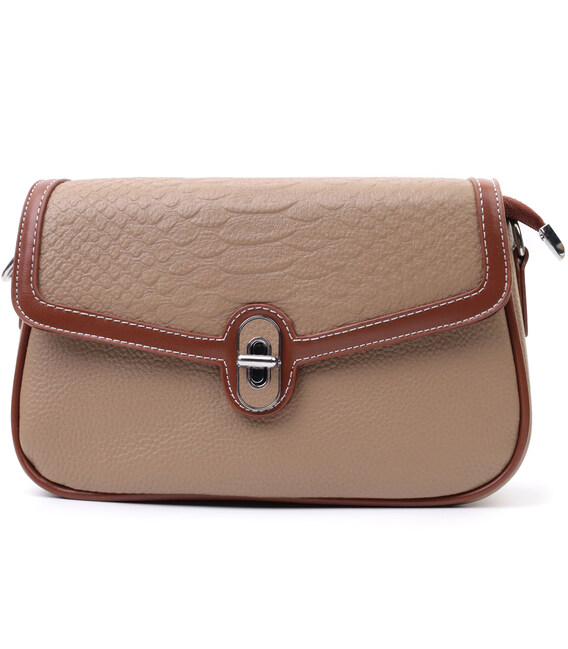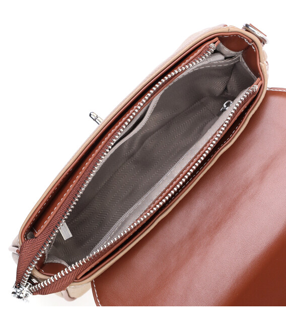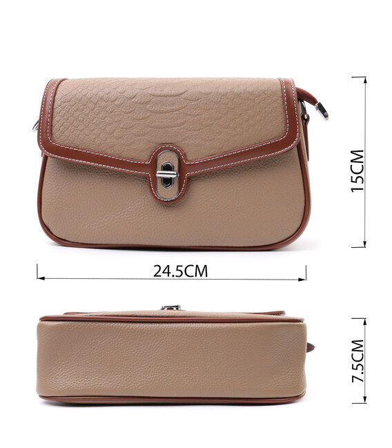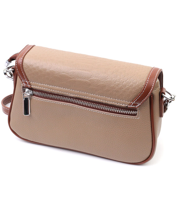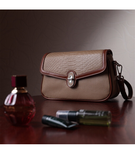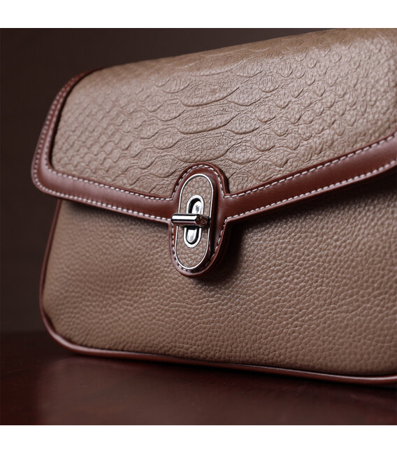 Стильная каркасная женская сумка из натуральной кожи. В изделии использована кожа бежевого и коричневого цвета. Притягує погляд у виробі фактурний клапан із тисненням під змію та витончена механічна клямка. Аксесуар складається з основного відділення, кишені-перегородки на блискавці, потайної кишені на блискавці та кишені відкритого типу, а також ще однієї кишені зовні, на тильній стороні. Носити сумку можна в руці, під рукою, на плечі і через плече, для цього є шкіряний ремінь, що знімається. В аксесуарі використано якісну фурнітуру кольору срібла. Універсальний варіант сумки на вечір, на щодня, а також буде відмінно поєднуватиметься з діловим стилем.