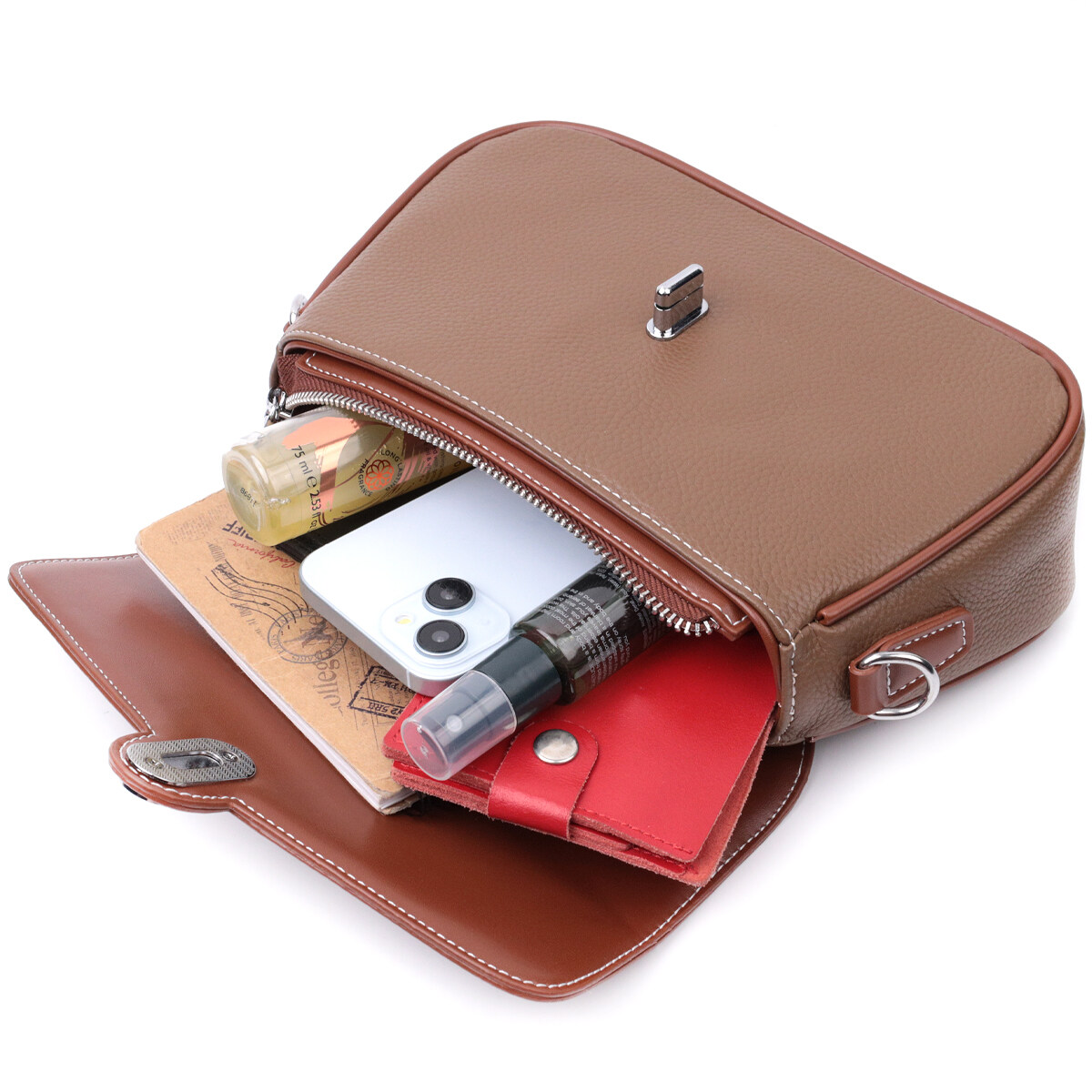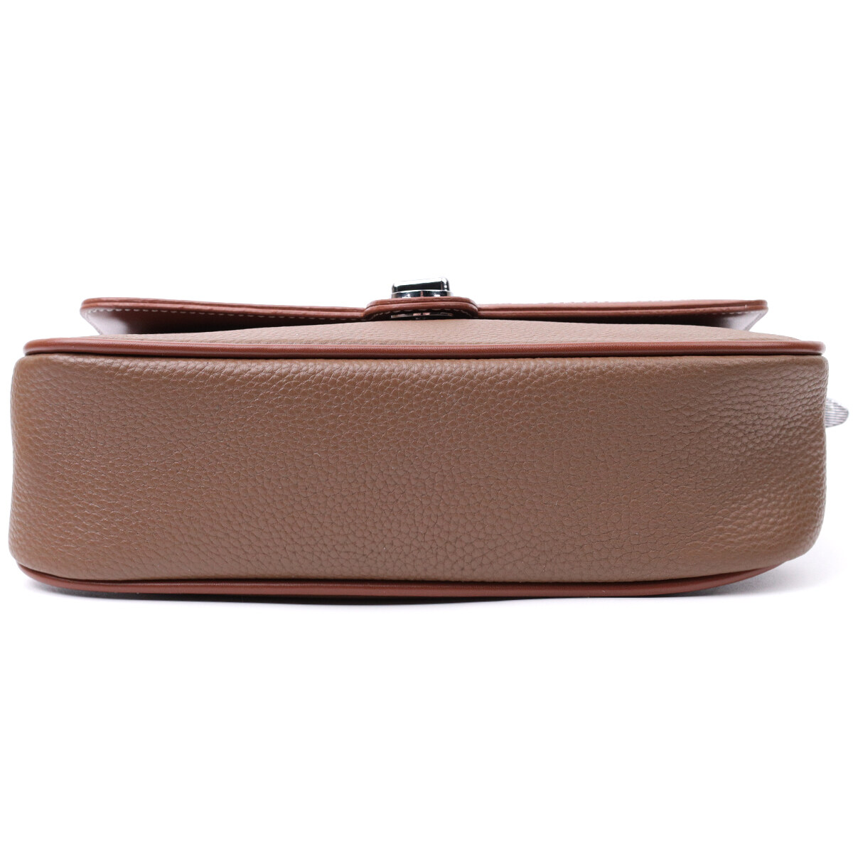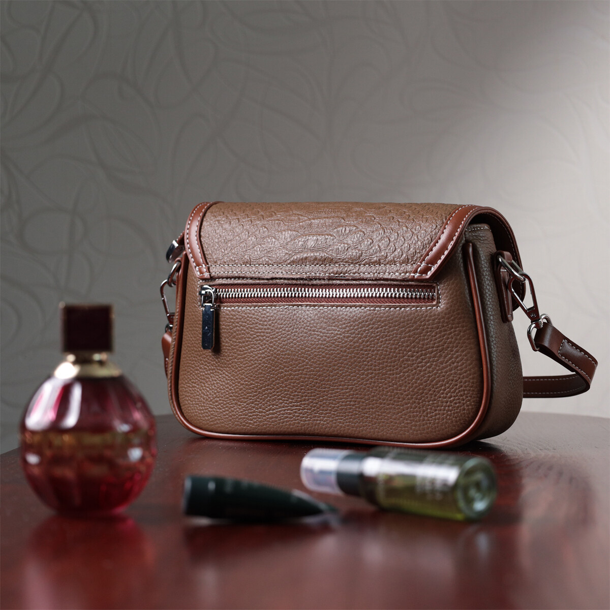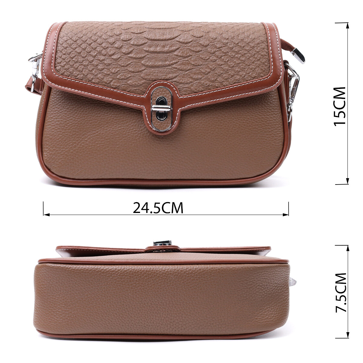 Зручна каркасна сумка жіноча з натуральної шкіри. У виробі використано шкіру коричневого кольору. Притягує погляд у виробі фактурний клапан із тисненням під змію та витончена механічна клямка. Аксесуар складається з
