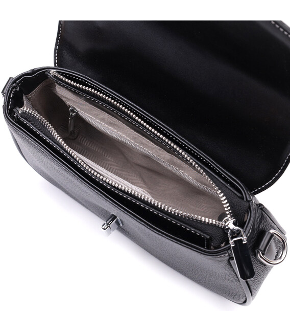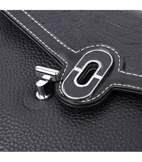 Зручна каркасна сумка жіноча з натуральної шкіри. У виробі використано шкіру чорного кольору з білим рядком по краю клапана. Притягує погляд у виробі фактурний клапан із тисненням під змію та витончена механічна клямка. Аксесуар складається з основного відділення, кишені-перегородки на блискавці, потайної кишені на блискавці та кишені відкритого типу, а також ще однієї кишені зовні, на тильній стороні. Носити сумку можна в руці, під рукою, на плечі і через плече, для цього є шкіряний ремінь, що знімається. В аксесуарі використано якісну фурнітуру кольору срібла. Універсальний варіант сумки на вечір, на щодня, а також буде відмінно поєднуватиметься з діловим стилем.