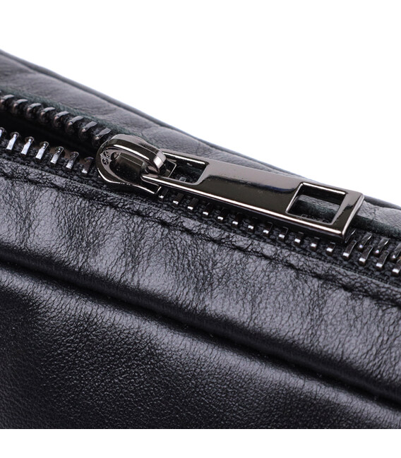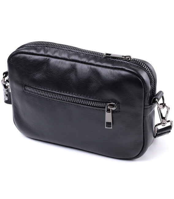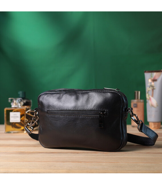 Цікава жіноча сумка, яку можна носити через плече як крос-боді, на плечі і як клатч в руках, для цього ремінець легко відстібається. Виріб виконаний у класичному чорному кольорі з гладкої з глянцевим блиском шкіри. Шкіра м'яка, приємна на дотик із високими показниками зносостійкості. Відмінний варіант як кожного дня, так і на вечір. Сумка добре тримає форму, має міцну підкладку, фурнітура срібного кольору – стійка не змінює свій колір у процесі носіння. Аксесуар чудово поєднується з усіма стилями в одязі та може стати чудовим подарунком на будь-яке свято.
