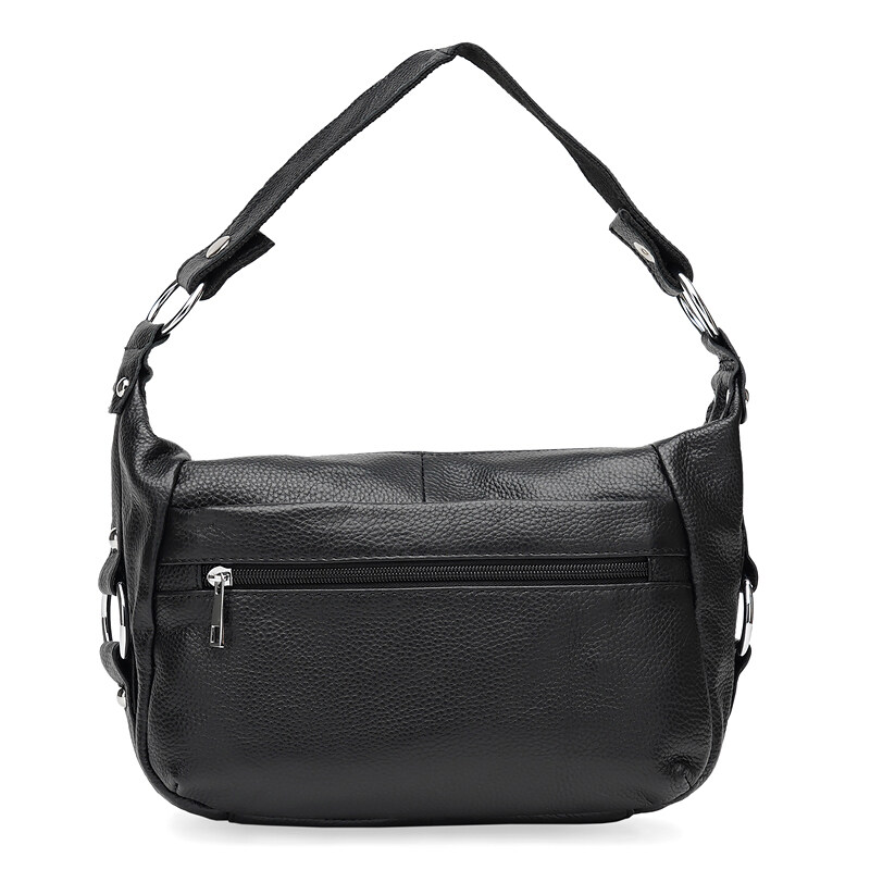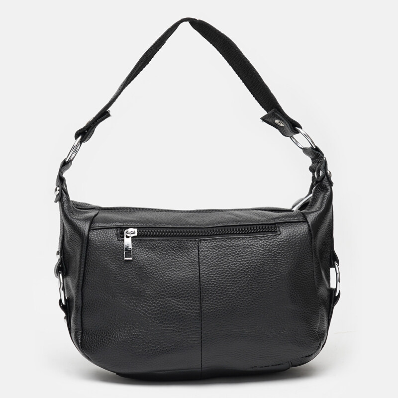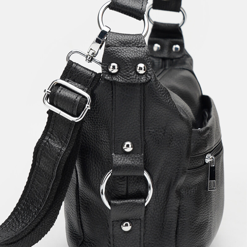 Жіноча сумка через плече виконана з натуральної шкіри. Має 1 основне відділеня на блискавці. Внутрішні 2 кишені на блискавці і 2 кишені під телефон та інші дрібниці. Зовні-3 кишені на блискавці. Підкладка-текстиль. Колір фурнітури-срібло. Знімний плечовий ремінь регулюється по довжині.