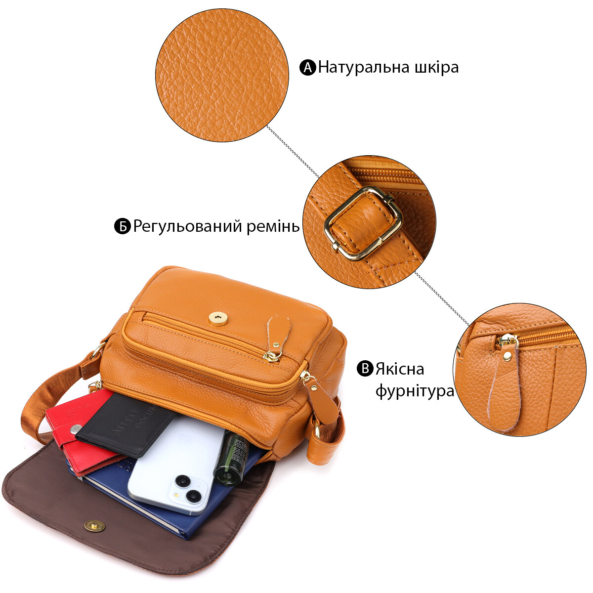 Ця шкіряна сумка на плече - ідеальний вибір для жінок, які цінують практичність, стиль та порядок у кожній деталі.