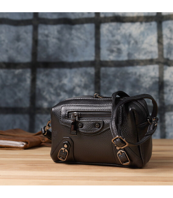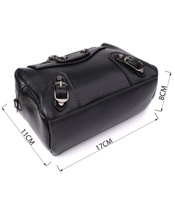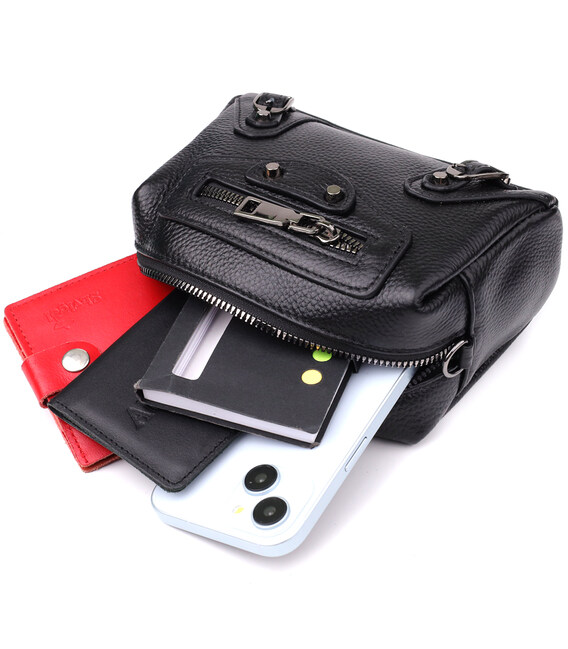 Невелика шкіряна жіноча сумка з декоративними елементами — стильна деталь для сміливого образу. Ця компактна модель відразу привертає увагу рахунок ефектного дизайну: чорна натуральна шкіра доповнена виразними металевими елементами, декоративним рядком і акцентною фурнітурою. Стильна зовнішня кишеня на блискавці обрамлена заклепками та декоративними ремінцями, надаючи аксесуару легку брутальність та характер.