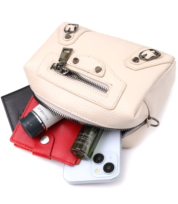 Ідеальний вибір для тих, хто цінує сміливі акценти та практичний формат – біла шкіряна сумка з декоративним оздобленням стане виразною деталлю у будь-якому образі, від casual до міського шику.