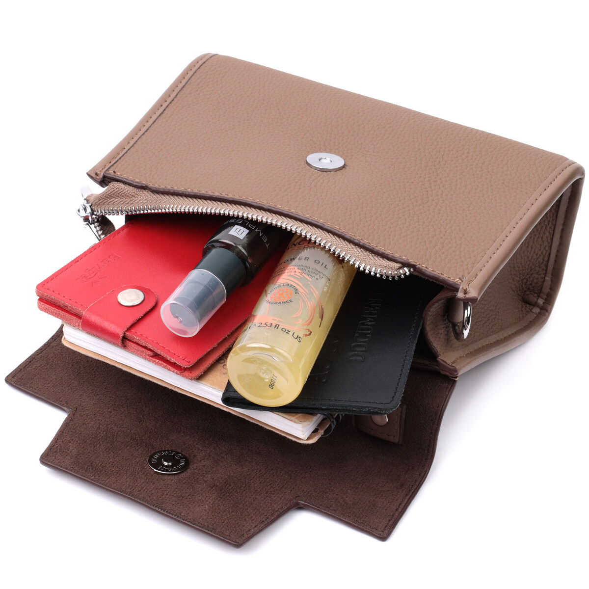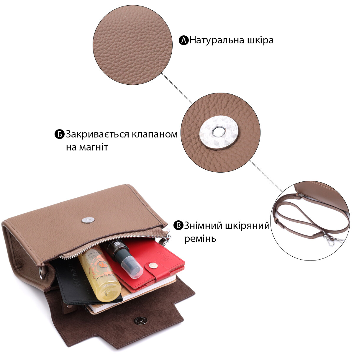 Ділова сумка з маленькою ручкою для перенесення в руках з натуральної якісної шкіри. Аксесуар складається з основного відділення, яке закривається на блискавку та клапан з магнітом, потайної кишені на блискавці та кишені відкритого типу всередині. Носити сумку можна в руці, на плечі і через плече для цього є шкіряний ремінь, що знімається, і маленька шкіряна ручка. В аксесуарі використано якісну фурнітуру кольору срібла.
