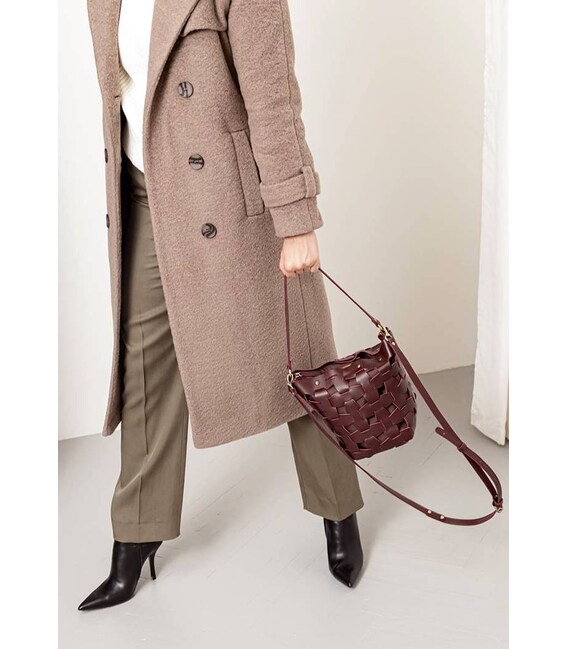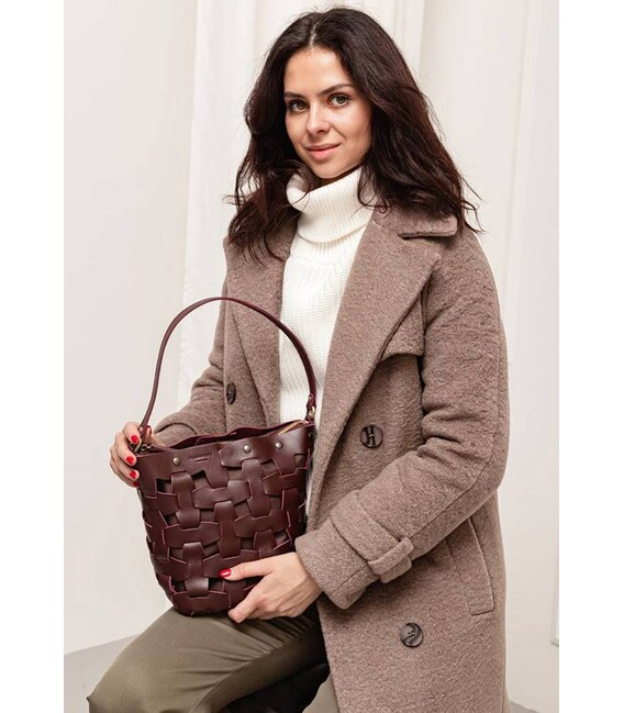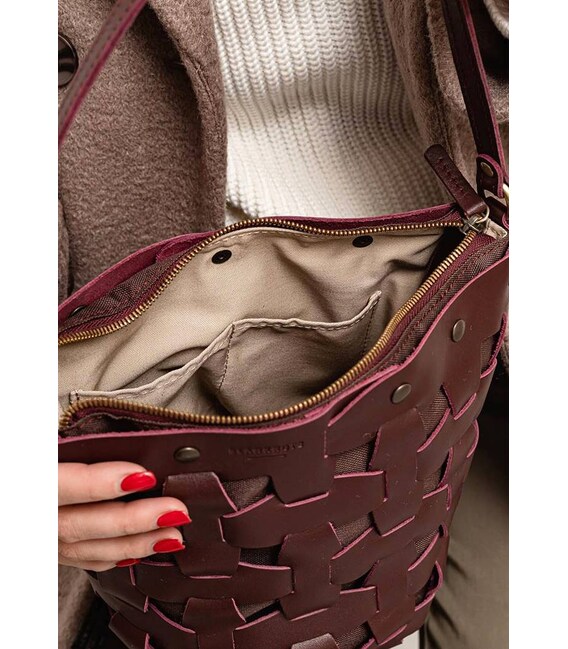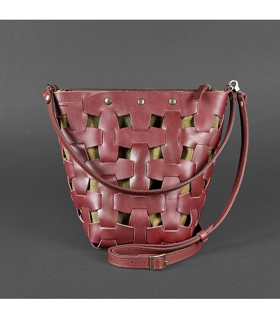 Виготовлена сумка з натуральної шкіри Krast в приємному винному відтінку. Каркас сумки виготовлений з шкіряних смужок, які з'єднуються за принципом пазлів. Елегантність бордового кольору каркаса підкреслена бронзою текстилю, з якого виготовлена внутрішня сумка. Для її виготовлення використана тканина Cordura - міцна, зносостійка і стійка до вологи. Цю тканину широко застосовують у виготовленні одягу і аксесуарів для туристів.