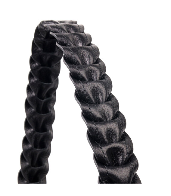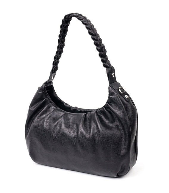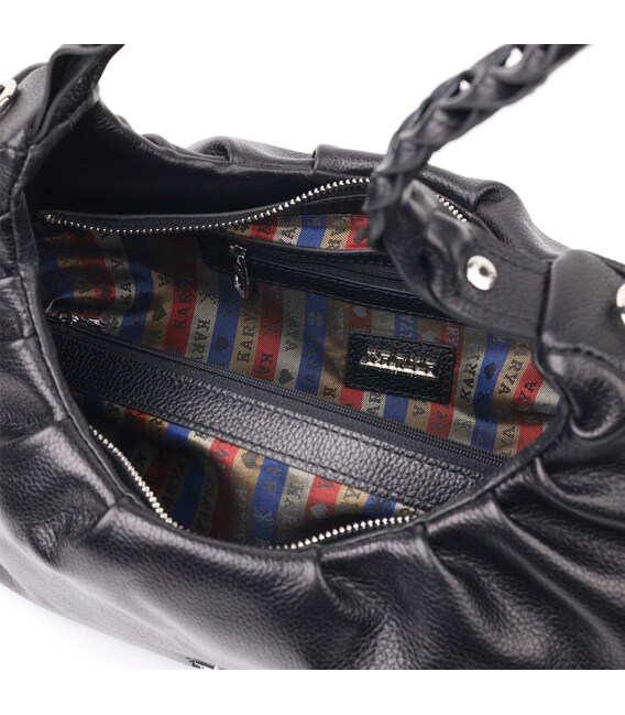 Чудова сумка-багет середнього розміру з натуральної крупнозернистої шкіри в класичному чорному кольорі. Виріб має надійну плетену ручку для перенесення в руці, а також знімний шкіряний і регульований по довжині, плечовий ремінь. Сумка функціональна та зручна в експлуатації, виріб має якісну фурнітуру сріблястого кольору та міцну підкладку. Аксесуар упакований у фірмовий текстильний мішок Karya. Сумка з натуральної шкіри завжди буде чудовим подарунком будь-якій жінці.