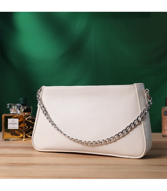 До вашої уваги представлена сумка яка втілює в собі елегантність та практичність. Така сумка у модному світі має назву – сумка багет. Колір виробу – ніжний бежевий, фактура – зерниста не вибаглива у догляді. Матеріал виконання – натуральна м'яка шкіра із високими показниками зносостійкості. Відмінний варіант як на кожен день, так і на вечір. Ремінець ланцюжок надає їй блиску та нотку витонченості. Дана модель не тільки приваблива зовні, а й продумана всередині, розташування та кількість внутрішніх кишень дозволить якісно організувати простір усередині, щоб усі речі лежали на своїх місцях. Модель виготовлена з якісних матеріалів, має тверде дно та добре тримає форму.