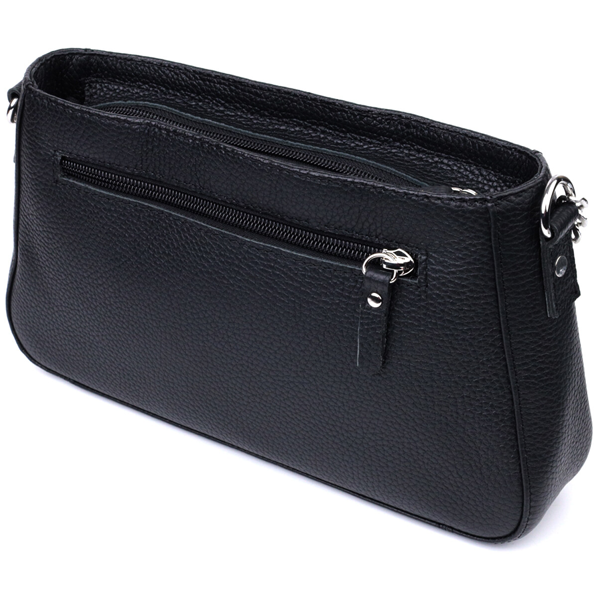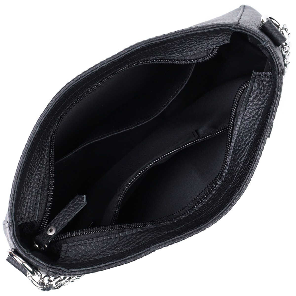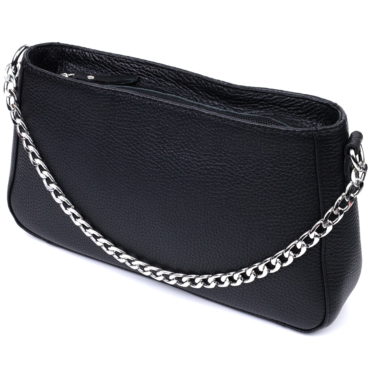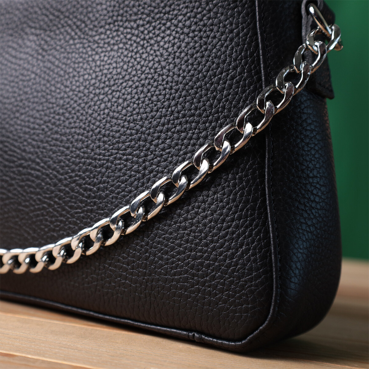 Представляємо Вам трендову сумку сезону, яка втілює елегантність і практичність. Така сумка у модному світі має назву – сумка багет. Колір виробу – класичний чорний, фактура – зерниста не вибаглива у догляді. Матеріал виконання – натуральна м'яка шкіра із високими показниками зносостійкості. Відмінний варіант як кожного дня, так і на вечір. Ремінець ланцюжок надає їй блиску та нотку витонченості. Дана модель не тільки приваблива зовні, а й продумана всередині, розташування та кількість внутрішніх кишень дозволить якісно організувати простір усередині, щоб усі речі лежали на своїх місцях. Модель виготовлена з якісних матеріалів, має тверде дно та добре тримає форму.