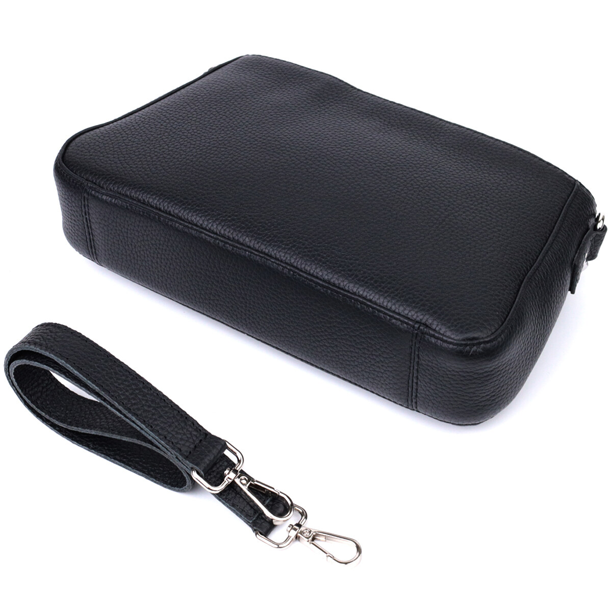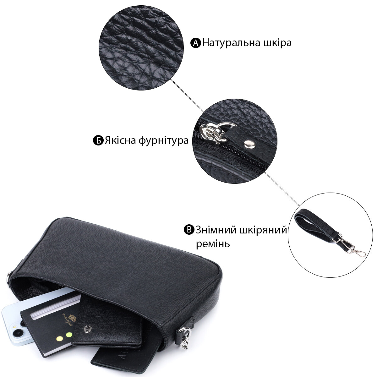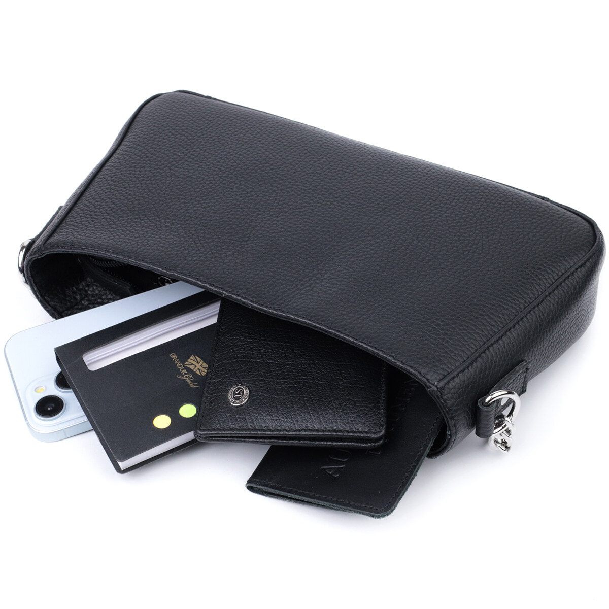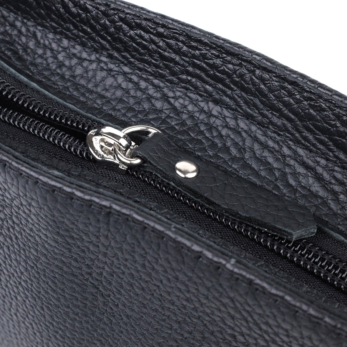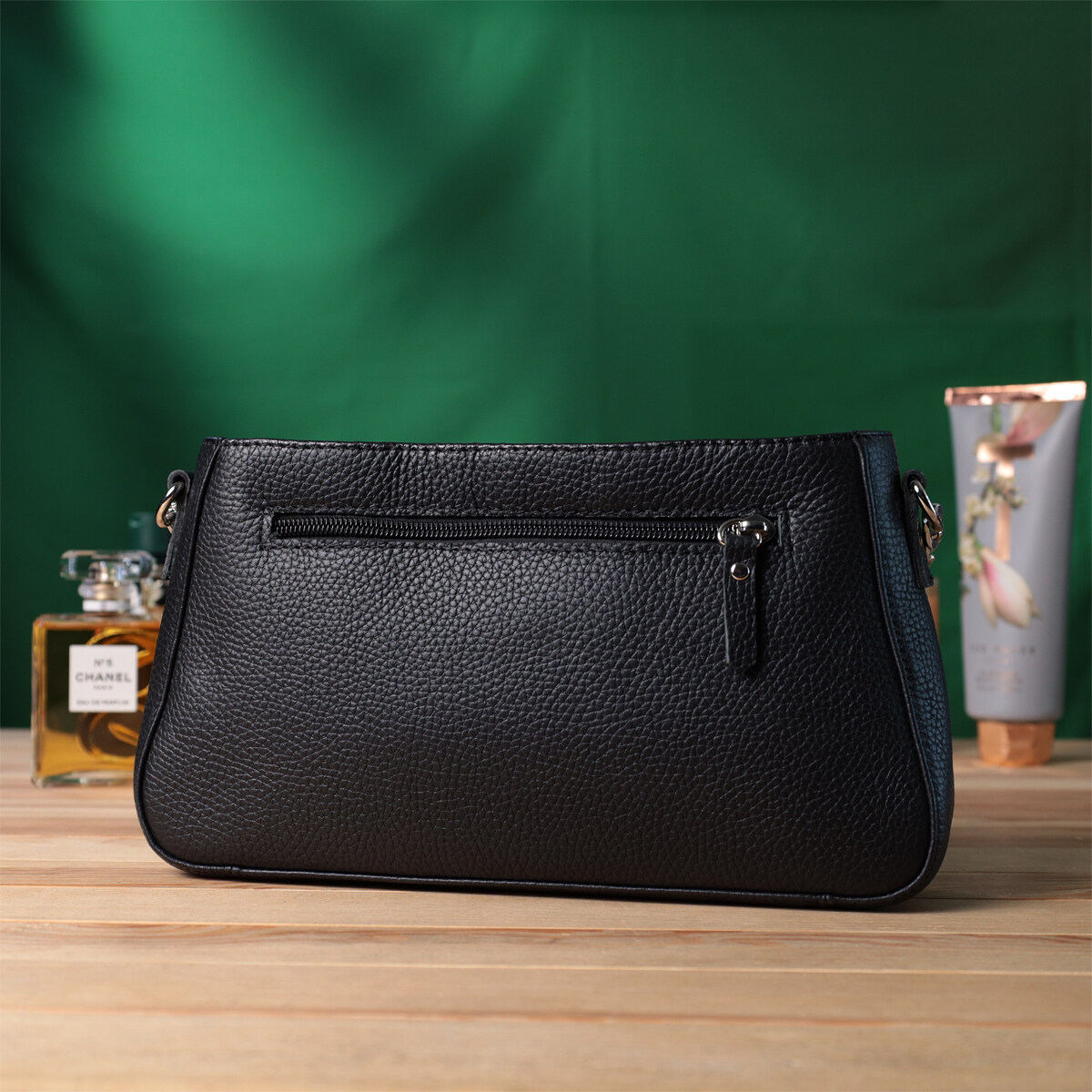 Представляємо Вам трендову сумку сезону, яка втілює елегантність і практичність. Така сумка у модному світі має назву – сумка багет. Колір виробу – класичний чорний, фактура – зерниста не вибаглива у догляді. Матеріал виконання – натуральна м'яка шкіра із високими показниками зносостійкості. Відмінний варіант як кожного дня, так і на вечір. Ремінець ланцюжок надає їй блиску та нотку витонченості. Дана модель не тільки приваблива зовні, а й продумана всередині, розташування та кількість внутрішніх кишень дозволить якісно організувати простір усередині, щоб усі речі лежали на своїх місцях. Модель виготовлена з якісних матеріалів, має тверде дно та добре тримає форму.