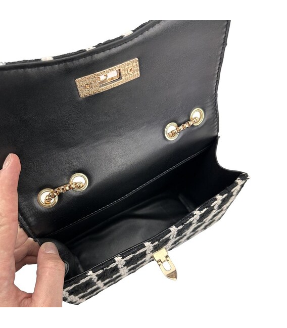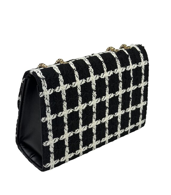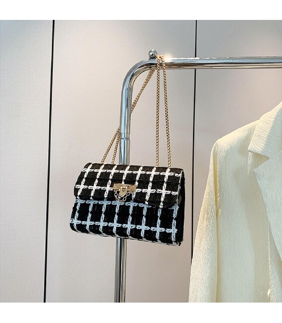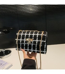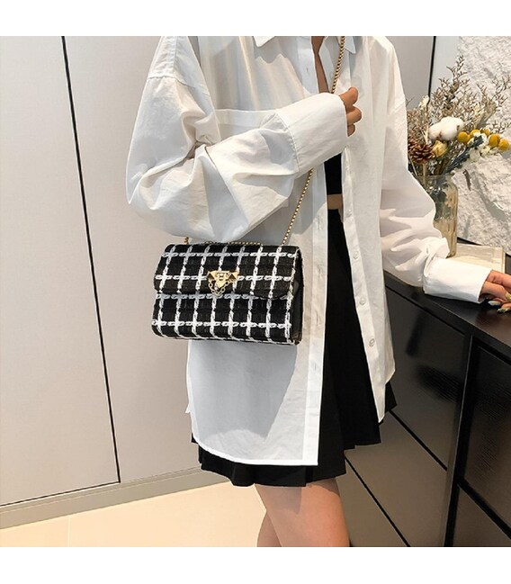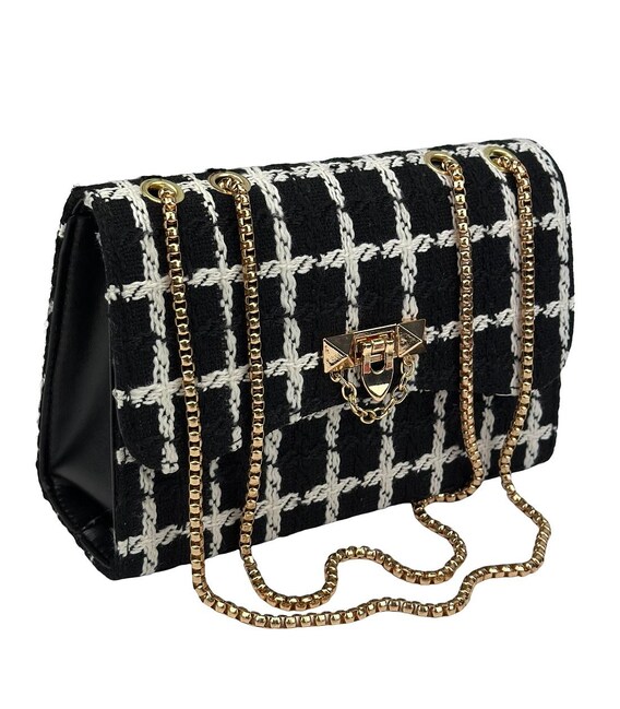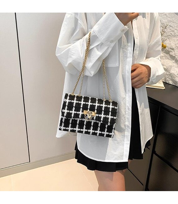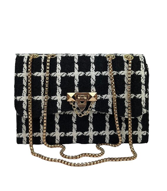 Твідова сумка на ланцюжку з клапаном Lilly P2-1401-1AОсобливості: розміри 21,5 x 15 x 8 см.Сумка має одне основне відділення, яке закривається клапаном. Наплічний довгий ланцюжок.Підкладка: без підкладки Колір: чорно-білий Колір фурнітури: золото.Знайшли цю модель дешевше? Зв'яжіться з нами, і ми запропонуємо Вам найнижчу ціну в Україні, тому що виробник цього товару.