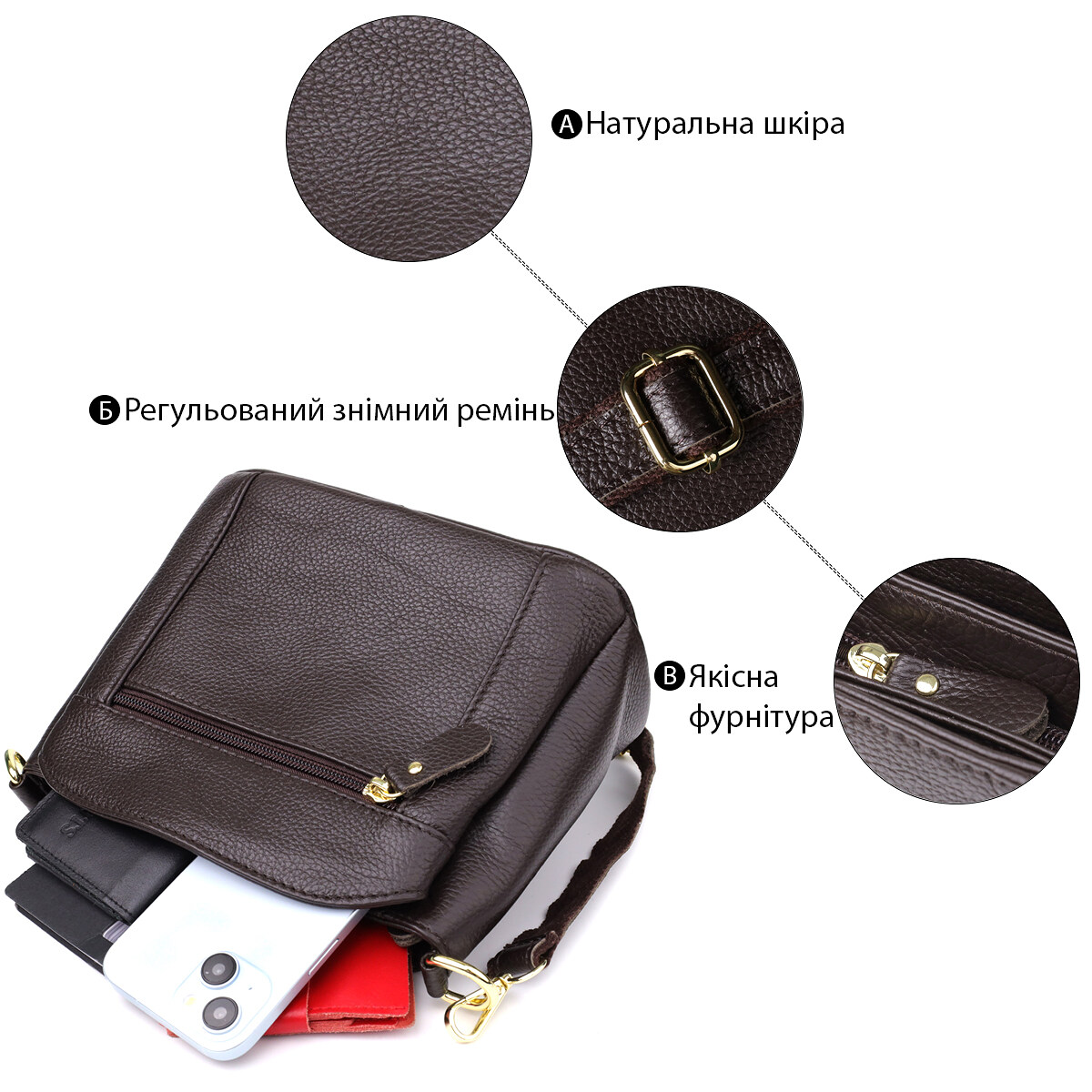Ця коричнева сумка - ідеальний вибір для тих, хто цінує практичність, натуральні матеріали та стриману елегантність у кожній деталі.