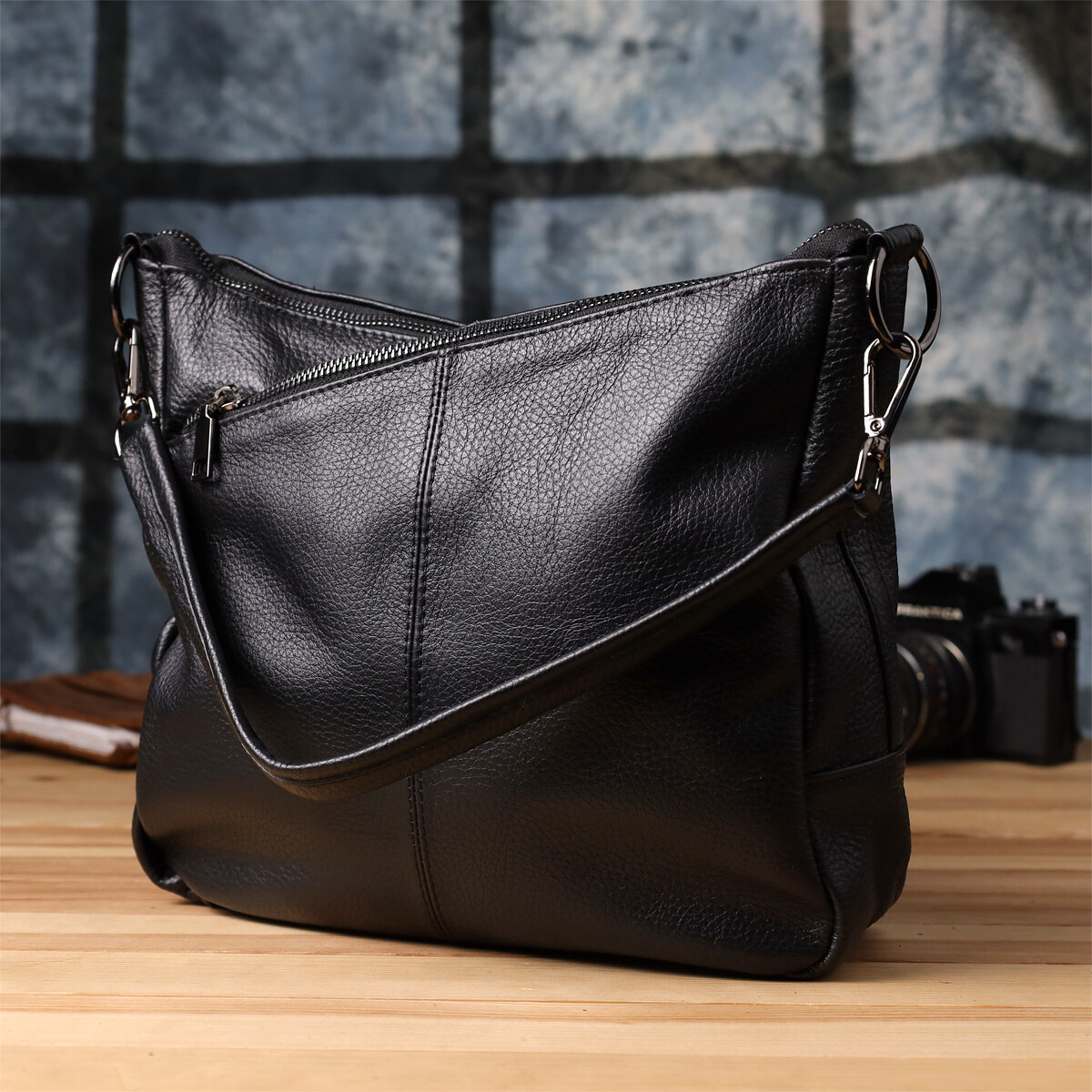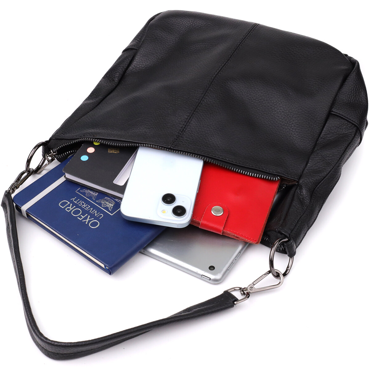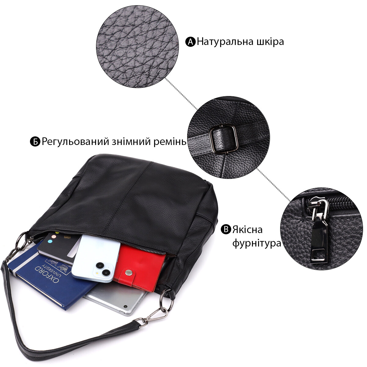 Стильна та практична сумка з натуральної шкіри у класичному чорному кольорі – ідеальний вибір для тих, хто цінує зручність, функціональність та елегантність. Ця модель продумана до дрібниць, щоби відповідати динамічному ритму життя сучасної жінки.