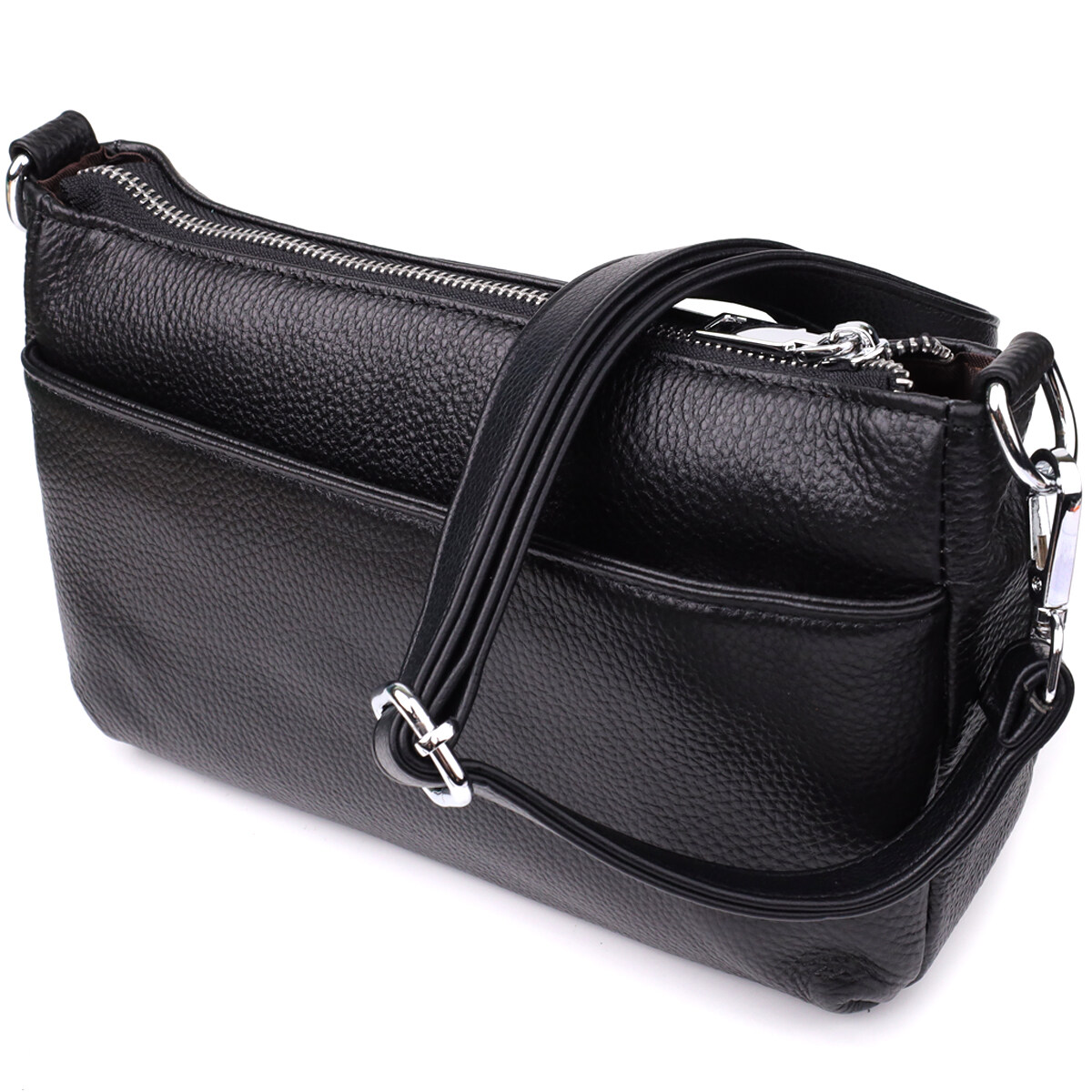 Чорна жіноча шкіряна сумка з двома ремінцями – універсальний аксесуар на кожен день. Ця модель виконана з натуральної шкіри у глибокому чорному кольорі, який завжди актуальний та легко поєднується з будь-яким гардеробом. Компактна та функціональна вона стане стильним доповненням як ділового, так і повсякденного образу.