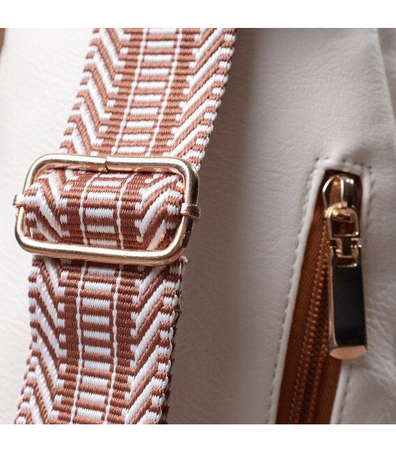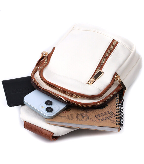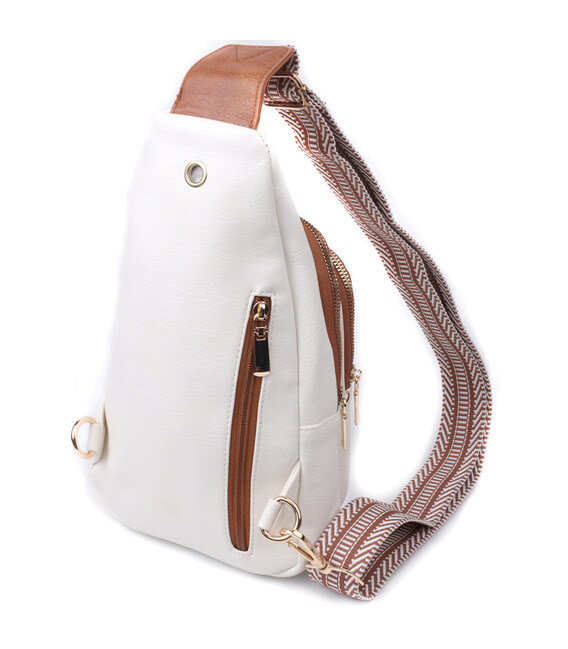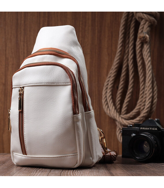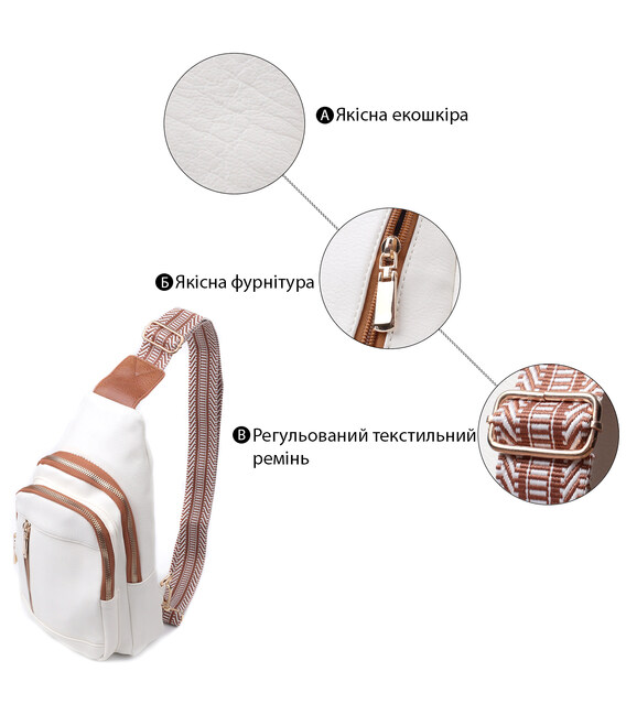 Красива слінг сумка з якісної екошкіри, в білому стильному кольорі з коричневими акцентами. Екошкіра – високоякісна альтернатива натуральному матеріалу, яка дуже стійка до тертя, до низьких температур, відмінно носиться на відміну від інших штучних матеріалів, а також має гіпоалергенний склад на відміну від натуральної шкіри. Дана модель складається з одного основного відділення, яке закривається на блискавку і в якому знаходиться потайна кишеня, а також трьох кишень зовні та одного отвору для кабелю або навушників, що дуже зручно в сучасному світі. Основною фішкою моделі є зручний регульований плечовий ремінець із стильним візерунком. Відмінний варіант сумки на кожен день та у будь-який сезон.