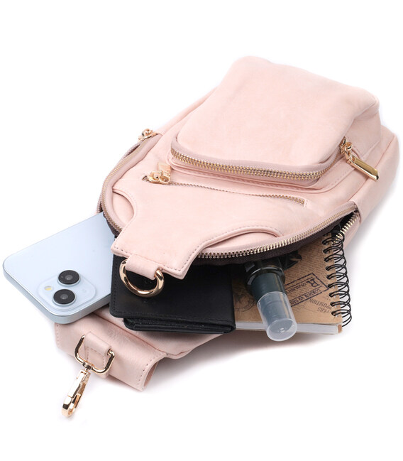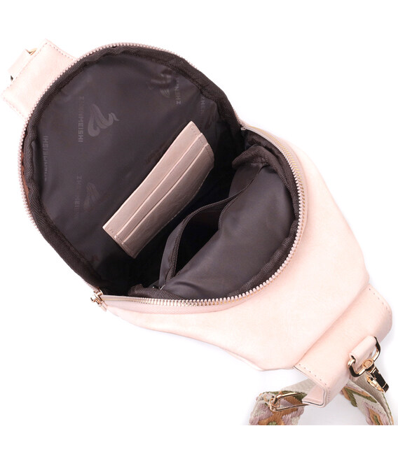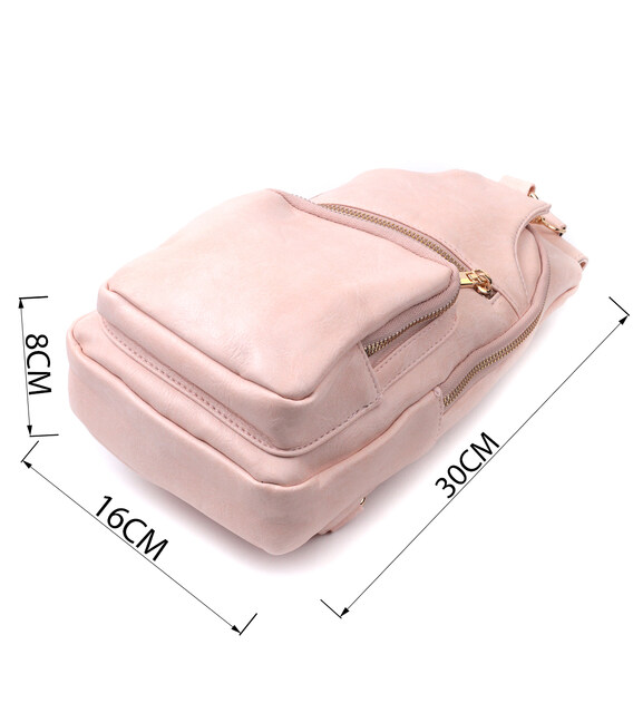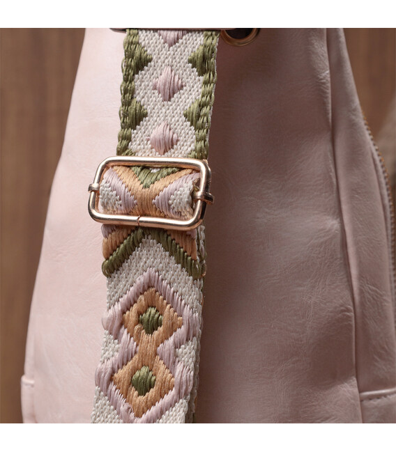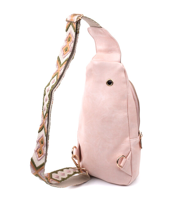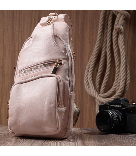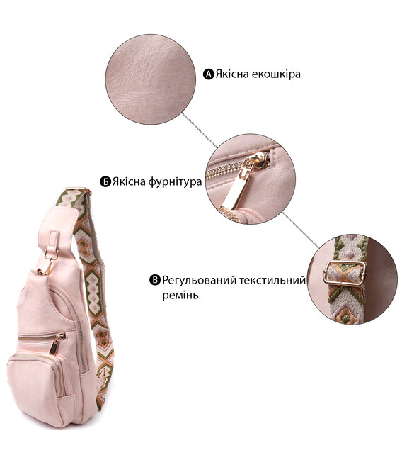 Екошкіра - високоякісна альтернатива натуральному матеріалу, яка дуже стійка до тертя, до низьких температур, відмінно носиться на відміну від інших штучних матеріалів, а також має гіпоалергенний склад на відміну від натуральної шкіри. Пропонуємо Вашій увазі зручну слінг сумку з екошкіри в рожевому кольорі. Ця модель складається з одного основного відділення, яке закривається на блискавку і в якому знаходиться кишеня на блискавці і три кишені для кредитних карток, а також три кишені зовні та один отвор для кабелю або навушників, що дуже зручно в сучасному світі. Основною фішкою моделі є зручний регульований плечовий ремінець у етнічному стилі, що дуже модно вже кілька сезонів.
