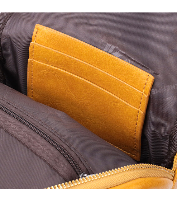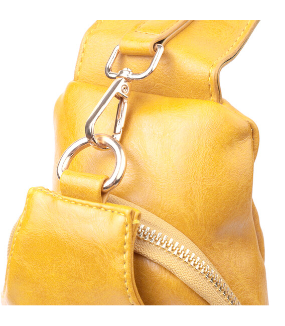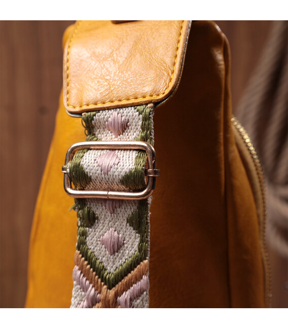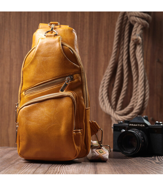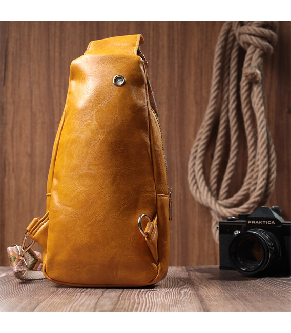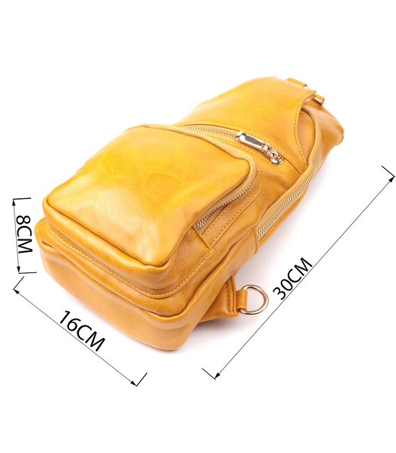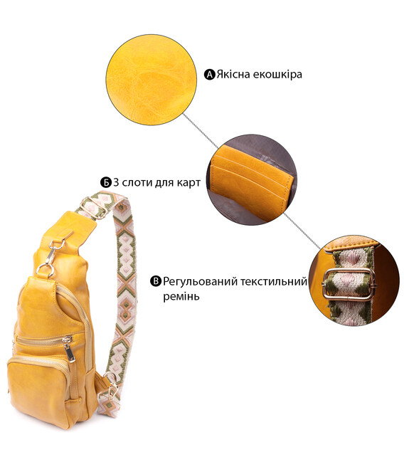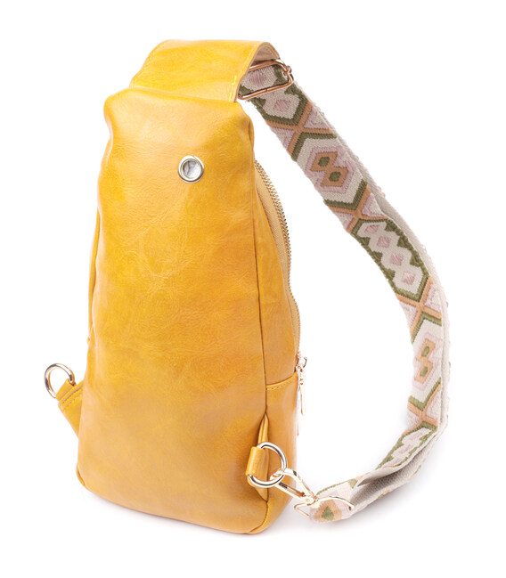 Екошкіра – високоякісна альтернатива натуральному матеріалу, яка дуже стійка до тертя, до низьких температур, відмінно носиться на відміну від інших штучних матеріалів, а також має гіпоалергенний склад на відміну від натуральної шкіри. Пропонуємо до Вашої уваги зручну слінг сумку з екошкіри в яскравому жовтому кольорі. Ця модель складається з одного основного відділення, яке закривається на блискавку і в якому знаходиться кишеня на блискавці і три кишені для кредитних карток, а також три кишені зовні та один отвор для кабелю або навушників, що дуже зручно в сучасному світі. Основною фішкою моделі є зручний регульований плечовий ремінець у етнічному стилі, що дуже модно вже кілька сезонів.