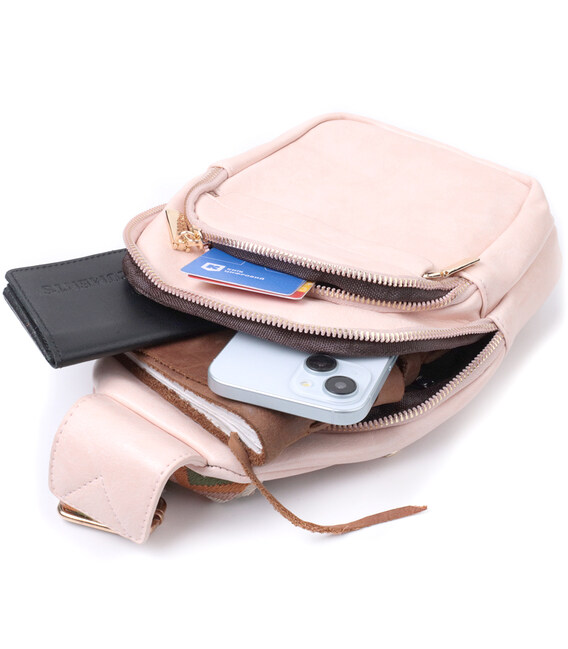 Компактна слінг сумка для жінок з гладкої екошкіри. Дана модель складається з одного основного відділення, яке закривається на блискавку і в якому знаходиться кишеня на блискавці і три кишені для кредитних карток усередині, а також трьох кишень зовні та одного отвору для кабелю або навушників, що дуже зручно в сучасному світі. Акцентом даної моделі є зручний регульований плечовий ремінець у етнічному стилі, що дуже модно вже кілька сезонів. Екошкіра - високоякісна альтернатива натуральному матеріалу, яка дуже стійка до тертя, до низьких температур, відмінно носиться на відміну від інших штучних матеріалів, а також має гіпоалергенний склад на відміну від натуральної шкіри.