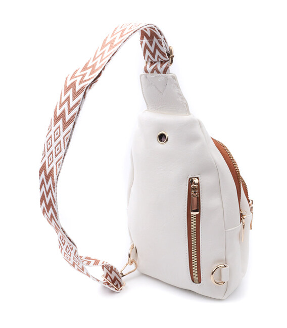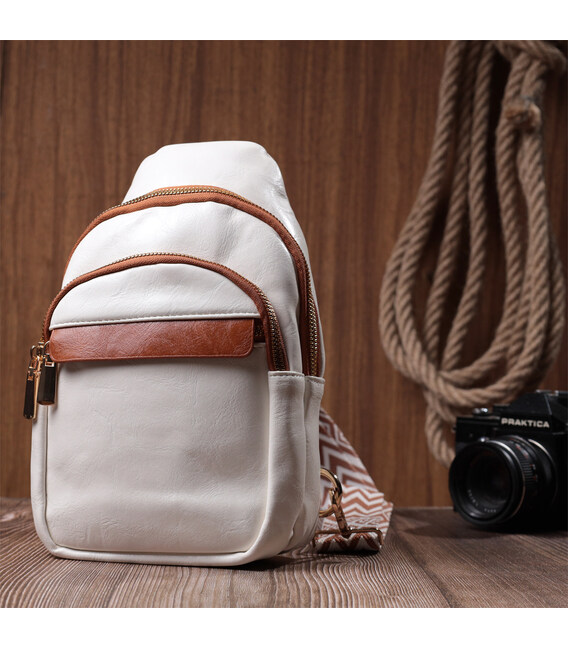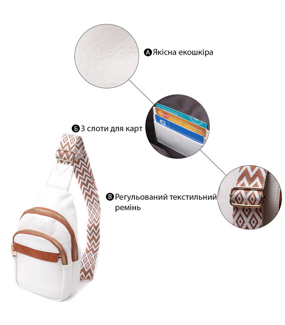 Зручна слінг сумка для жінок з гладкої екошкіри. Дана модель складається з одного основного відділення, яке закривається на блискавку і в якому знаходиться кишеня на блискавці і три кишені для кредитних карток усередині, а також трьох кишень зовні та одного отвору для кабелю або навушників, що дуже зручно в сучасному світі. Акцентом даної моделі є зручний регульований плечовий ремінець у етнічному стилі, що дуже модно вже кілька сезонів. Екошкіра - високоякісна альтернатива натуральному матеріалу, яка дуже стійка до тертя, до низьких температур, відмінно носиться на відміну від інших штучних матеріалів, а також має гіпоалергенний склад на відміну від натуральної шкіри.