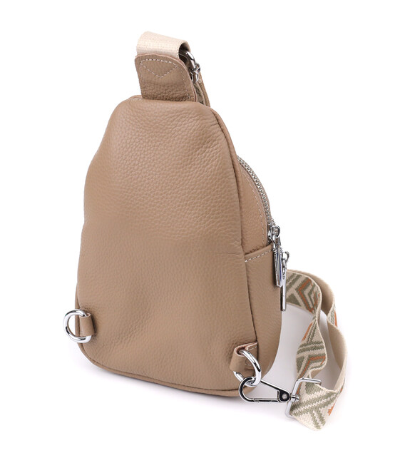 На особливу увагу заслуговує регульований текстильний ремінь з яскравим стильним візерунком - він не тільки забезпечує комфортну посадку на тілі, але і стає виразним елементом дизайну. Ремінь незнімний, але легко регулюється під ваше зростання і спосіб носіння. Фурнітура виконана в сріблястому кольорі, що надає аксесуару сучасний і стриманий блиск, який чудово поєднується з текстурою шкіри та акцентами ременя.