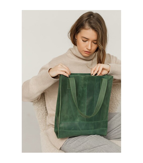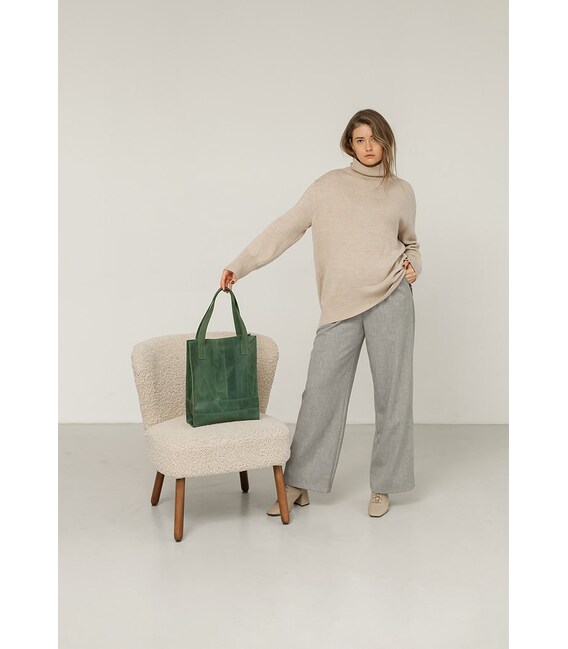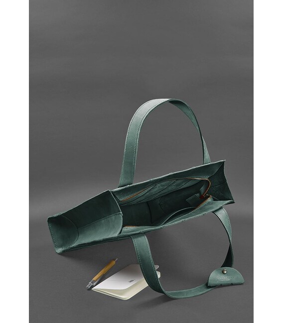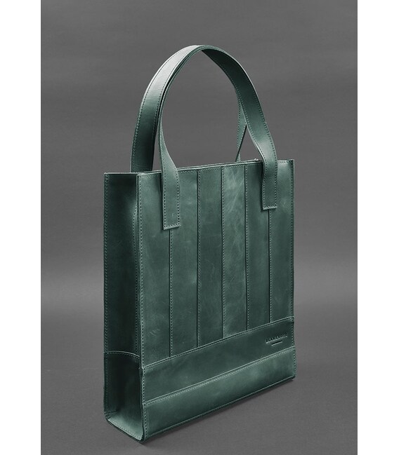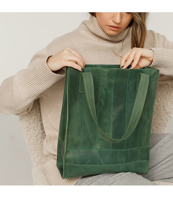 Шкіряний жіночий шоппер Бетсі - ідеальний варіант для тих, хто підбирає містку сумку на кожен день. Зелений шоппер виготовлений повністю вручну в нашій майстерні. Зшитий аксесуар зі смужок натуральної шкіри Crazy Хорс. Завдяки особливій вичинці, поверхня шкіри легко і швидко затирається, але це зовсім її не псує, а надає благородний зістарений вигляд. Crazy Horse досить щільна, еластична і зносостійка шкіра. Вона має матову поверхню і м'яку внутрішню сторону.