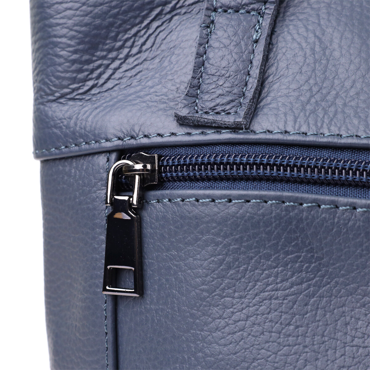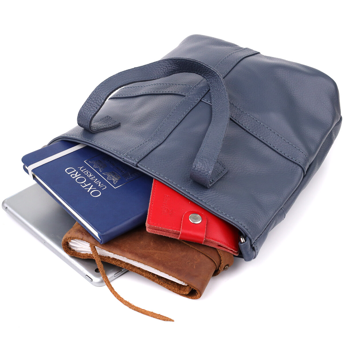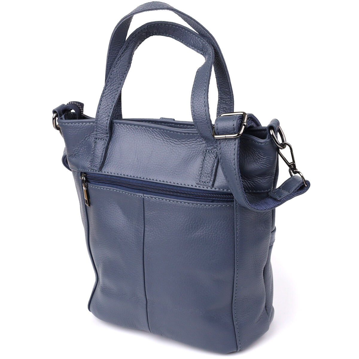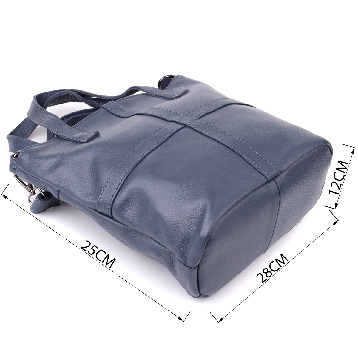 Стильна синя шкіряна сумка у формі трапеції – це елегантний та універсальний аксесуар, який поєднує сучасний дизайн та практичність. Виконана з натуральної шкіри високої якості, вона відрізняється щільною текстурою, міцністю та виразним глибоким відтінком синього кольору.