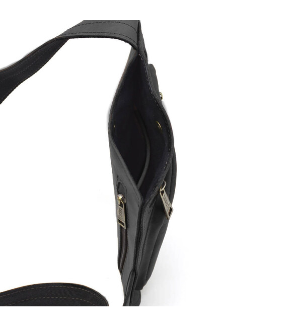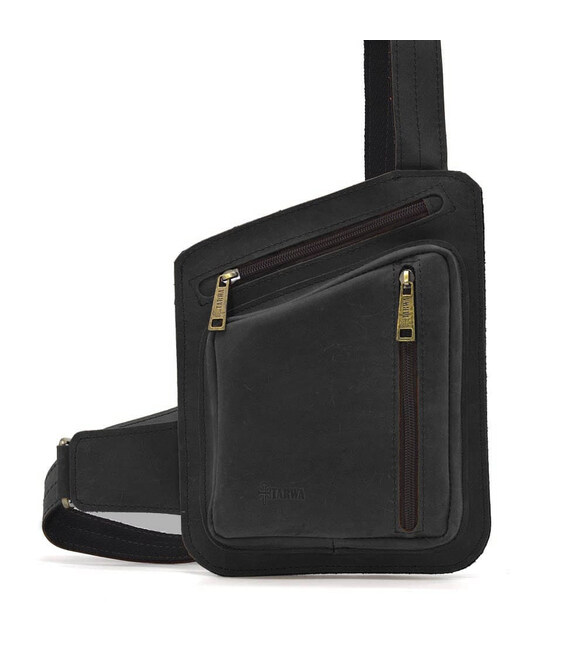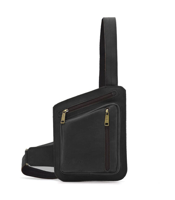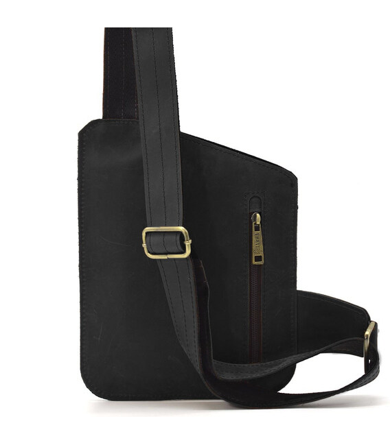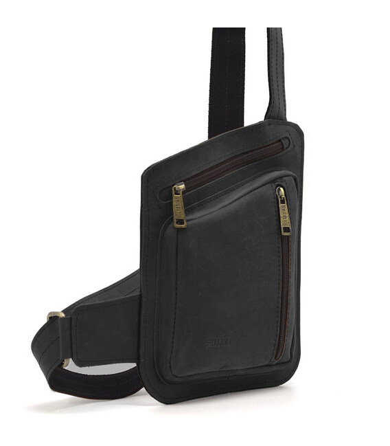 Шкіряна нагрудна сумка, рюкзак-слінг із кінської шкіри TARWA RA-235-3md у чорному кольорі. Відкрита верхня кишеня без блискавки для швидкого доступу під праву руку. Шкіряний ремінь з регулюванням довжини