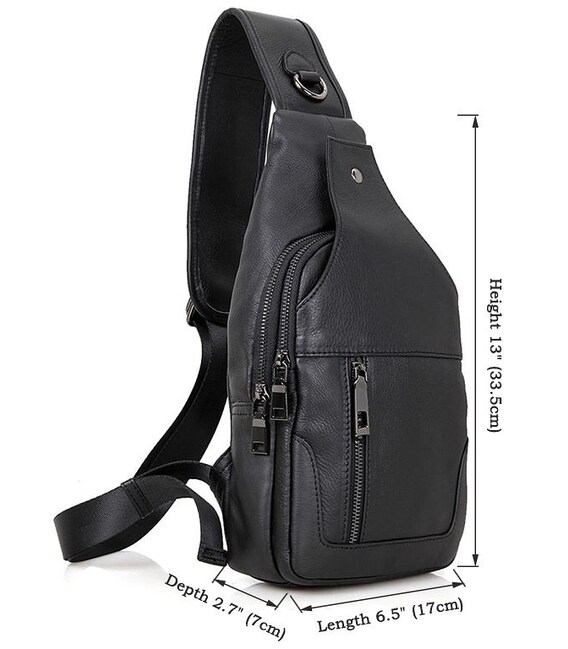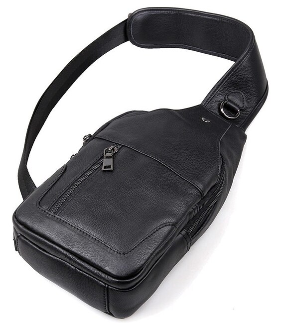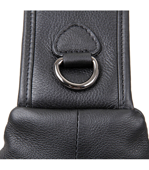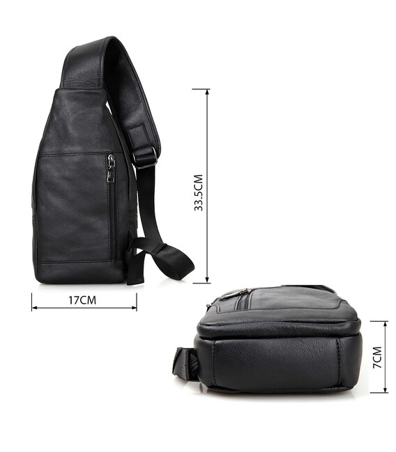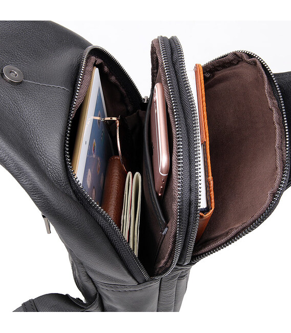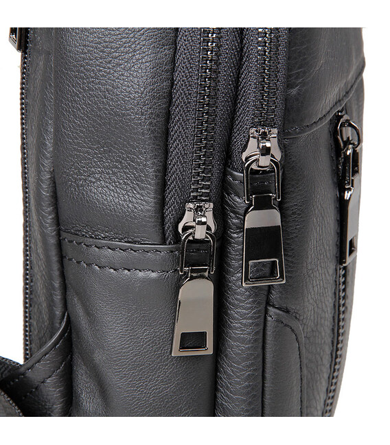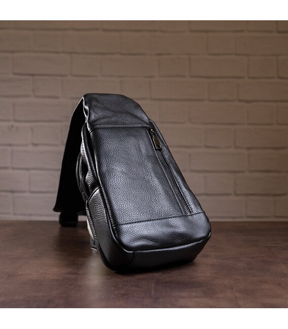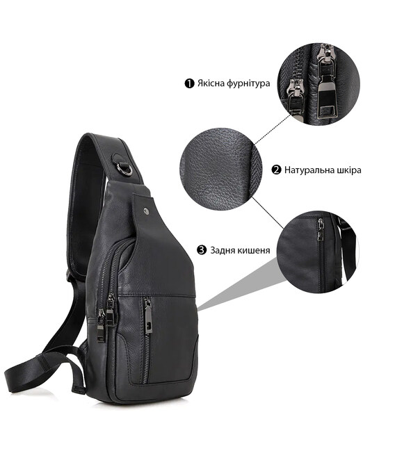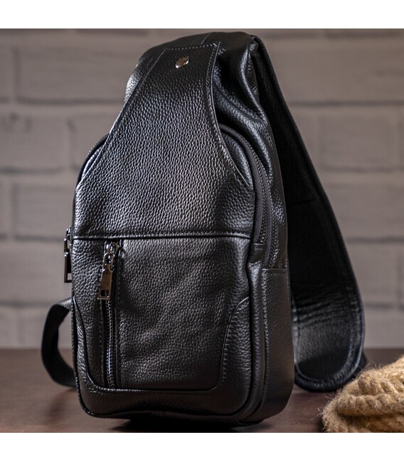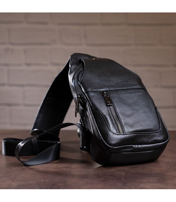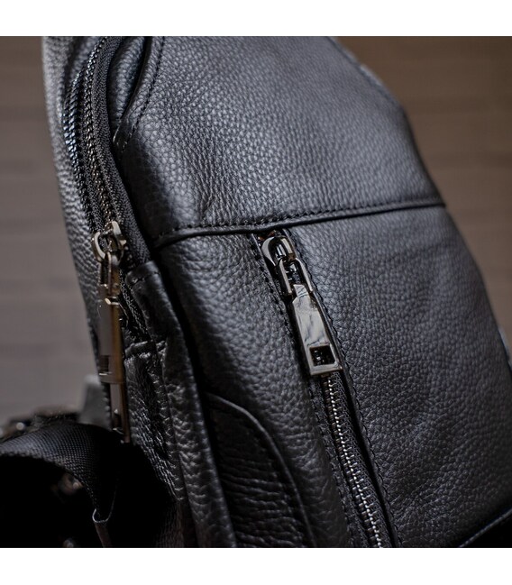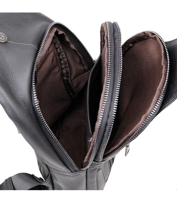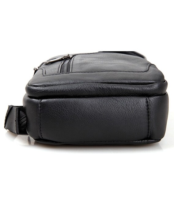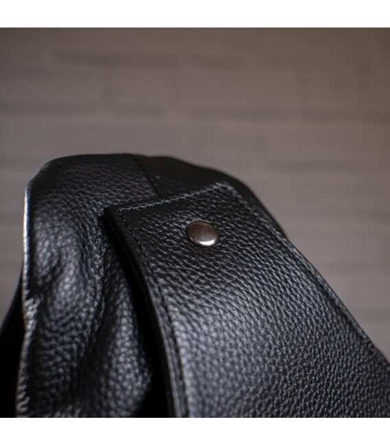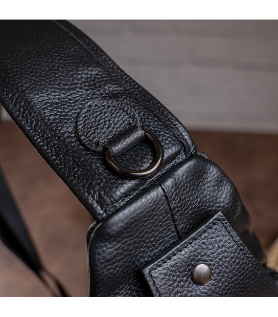 Зручна шкіряна сумка чорного кольору, яку можна носити як чоловікам, так і жінкам. Колір фурнітури: темне срібло. На лицевій і задній зовнішній стороні даної моделі знаходиться по одній кишені на блискавках. Аксесуар має два основних відділення на блискавках, які закриваються декоративним шкіряним хлястиком на магнітній кнопці. У другому основному відділенні знаходиться потаємне відділення на блискавці і невелика накладна кишеня.