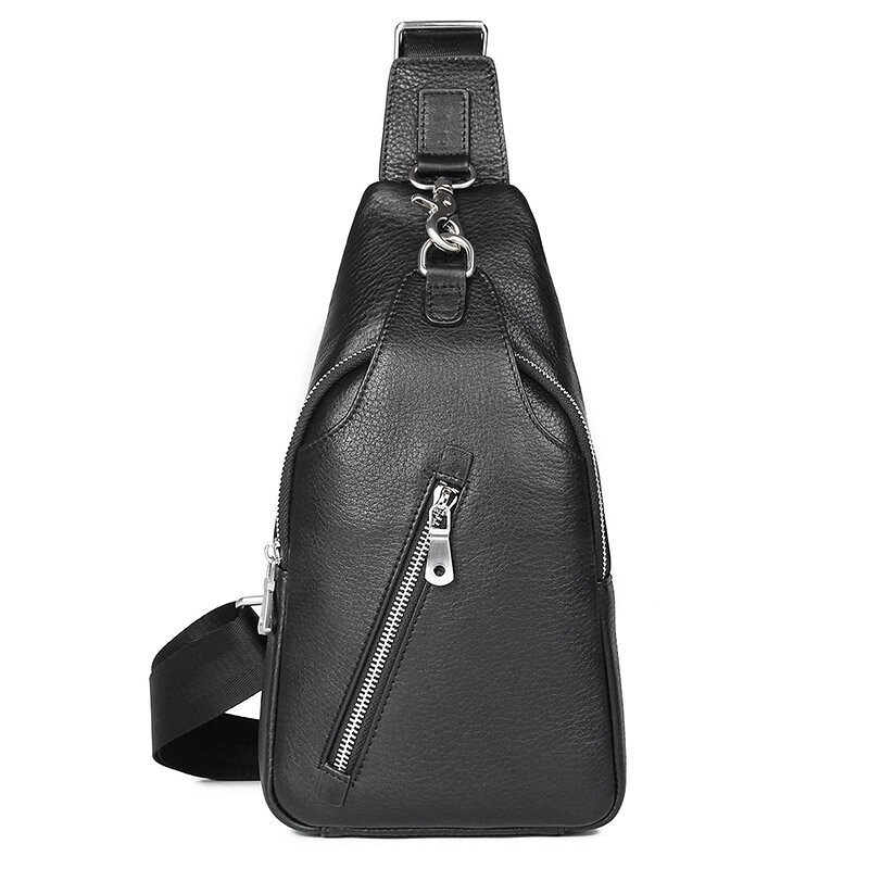 Виріб виконаний із натуральної зернистої шкіри чорного кольору. Матеріал приємний на дотик, виглядає стильно і добре підходить для активного повсякденного використання. Сумка доповнена міцною металевою фурнітурою, а по краях прошита міцною текстильною строчкою, що підкреслює акуратність виконання і загальний характер моделі.