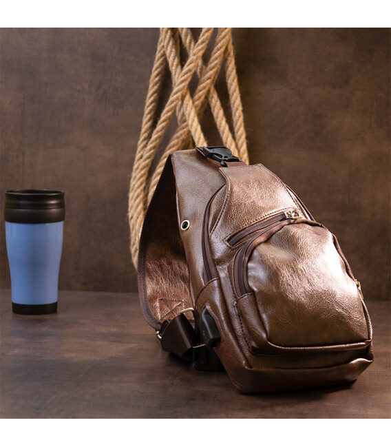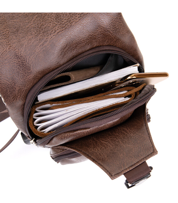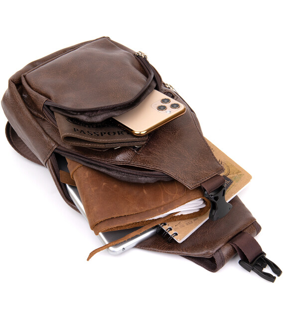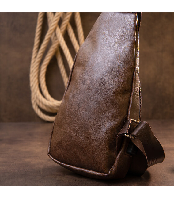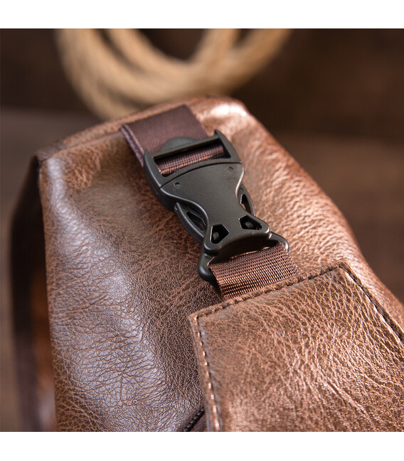 Виріб виконаний з якісної екошкіри коричневого кольору. Матеріал виглядає акуратно і добре підходить для щоденного використання. Вертикальний формат робить сумку зручною для розміщення особистих речей, документів та інших необхідних дрібниць.