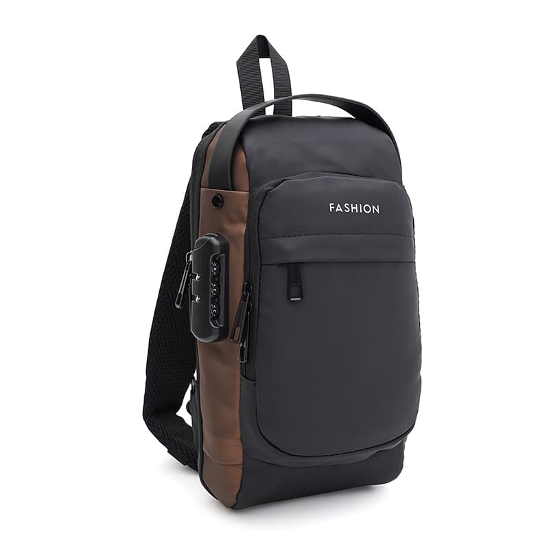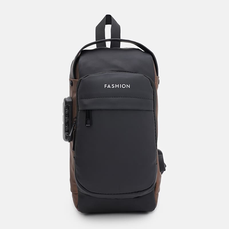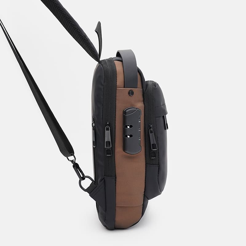 Чоловічий рюкзак через плече виконаний із якісного текстилю. Має 1 відділення на блискавці. Усередині 3 кишені для телефону та дрібниць. З лицьового боку 2 кишені на блискавці, з тильної-1 кишеня на блискавці. Текстиль підкладка. Незнімний ремень регулюється по довжині.