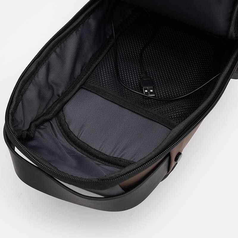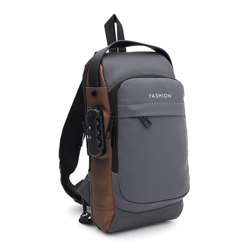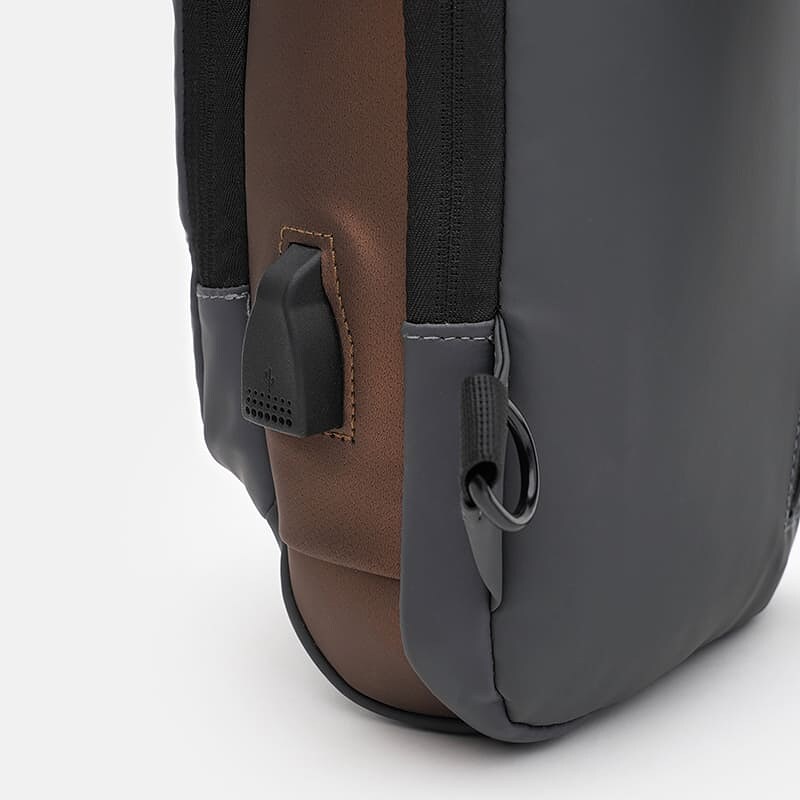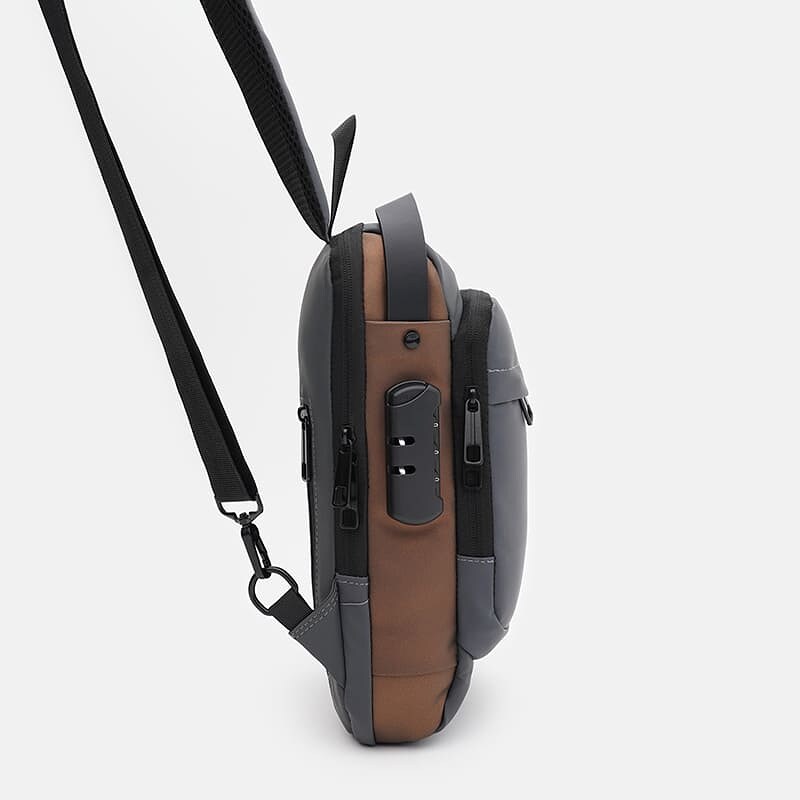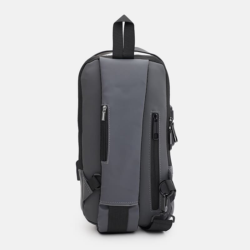 Чоловічий рюкзак через плече виконаний із якісного текстилю. Має 1 відділення на блискавці. Усередині 3 кишені для телефону та дрібниць. З лицьового боку 2 кишені на блискавці, з тильної-1 кишеня на блискавці. Текстиль підкладка. Незнімний ремень регулюється по довжині.