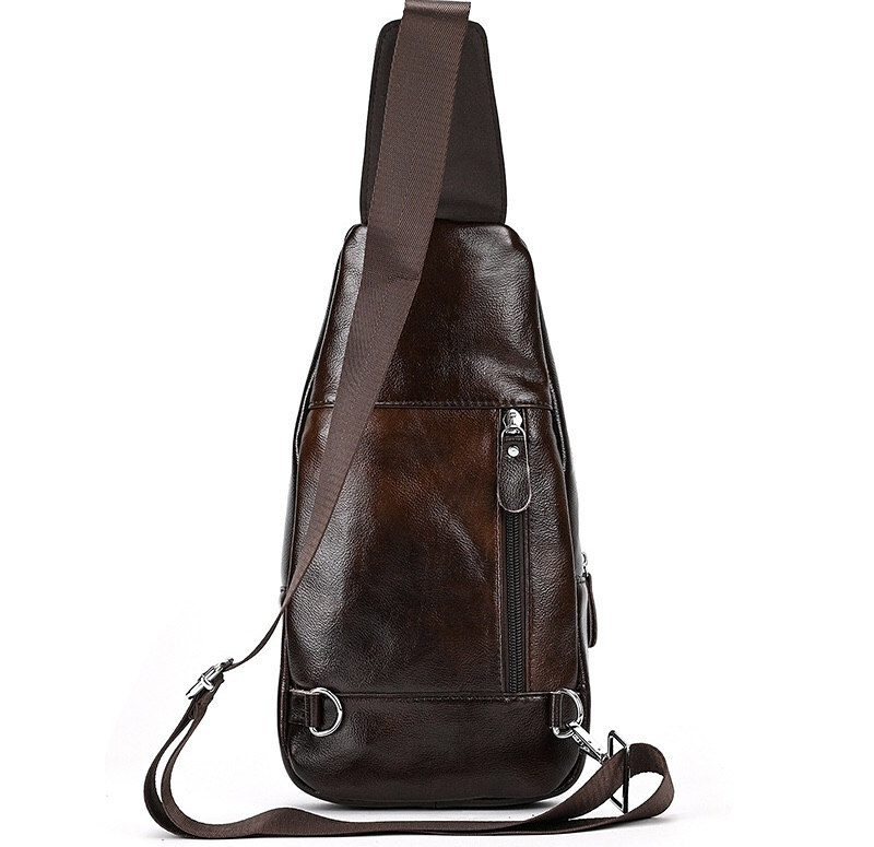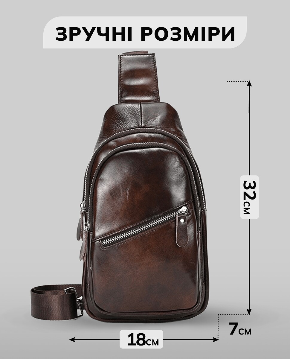 Чоловіча сумка-слінг дуже практична та зручна. Її можна носити й на плечі, і через плече. Водночас регульований ремінь не тисне і не тріт. Два роздільні відділення застібаються блискавками та вирізняються місткістю. Для зручності в чоловічій шкіряній сумці передбачені дві кишені: спереду та на спинці. Оскільки вони не великі, то в них можна покласти ключі, гаманець, окуляри або документи, і вони завжди будуть під рукою. Гладка шкіра, з якої виготовлена модель, є зносостійкою, тому не стирається під час носіння.