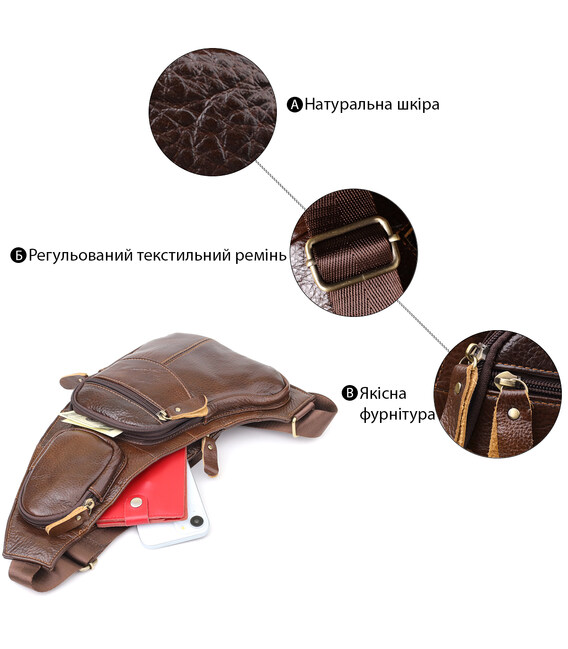Ця шкіряна сумка через плече з великою кількістю кишень — універсальний аксесуар для активного життя, який поєднує зручність, стиль і якість.