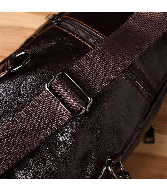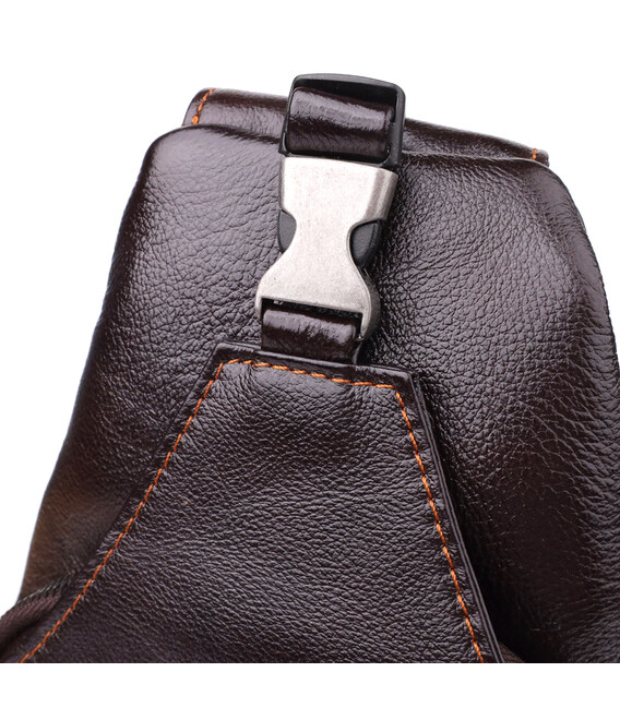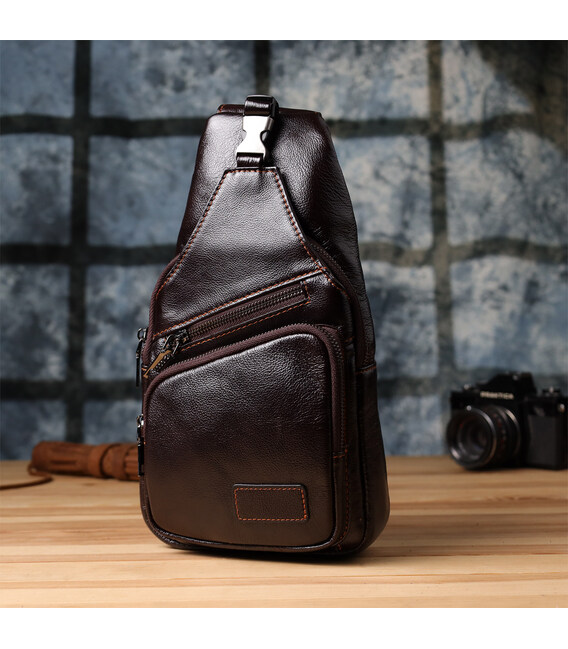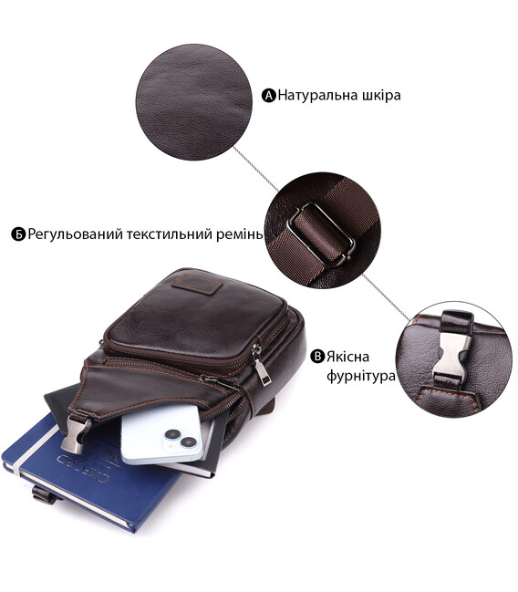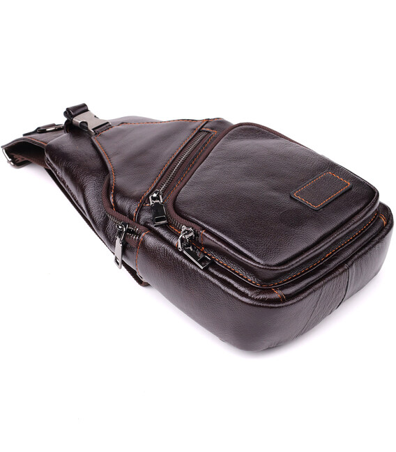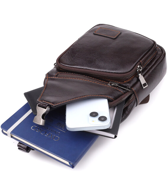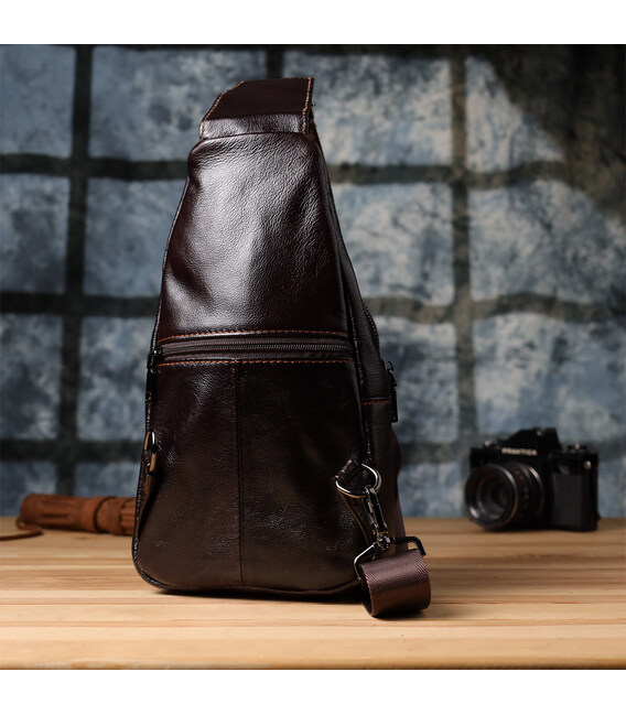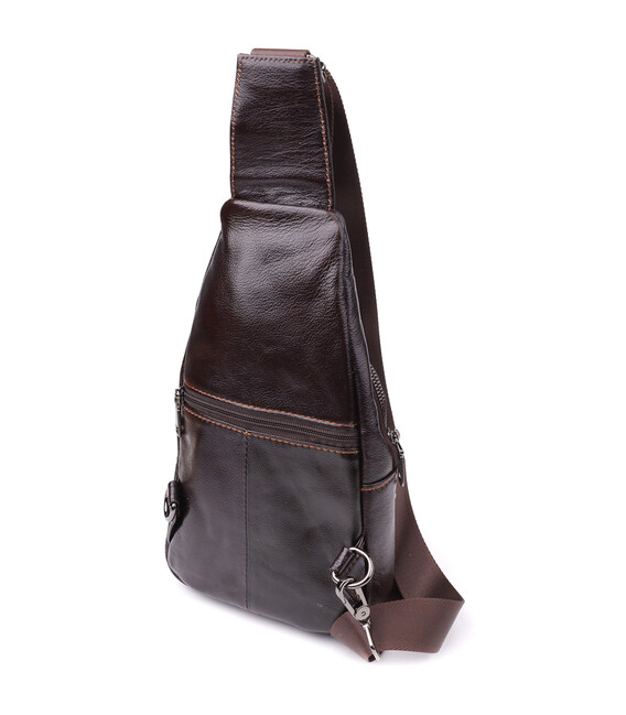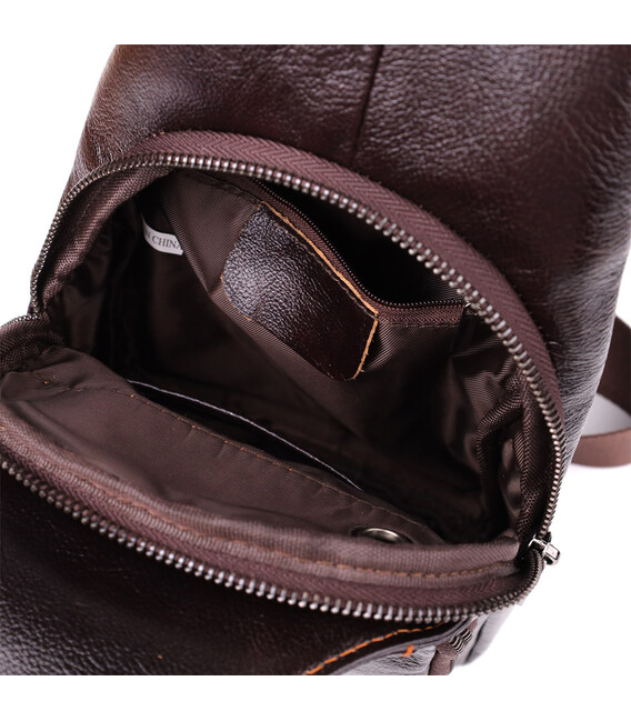 Стильна чоловіча шкіряна сумка через плече відрізняється продуманим дизайном та функціональністю. Одне основне відділення на блискавці забезпечує надійне зберігання речей. Усередині розташовані дві кишені — одна на блискавці для цінних предметів і одна відкритого типу для швидкого доступу.