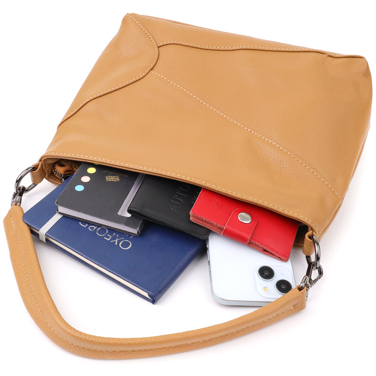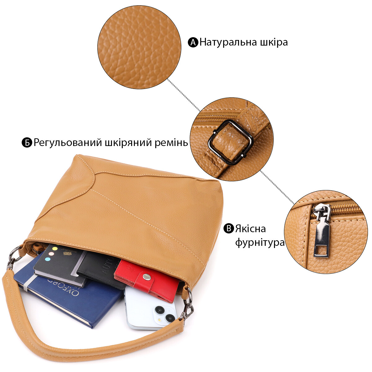 Ця світло-коричнева шкіряна сумка стане надійним та елегантним супутником, який поєднує в собі комфорт, функціональність та витончений смак.