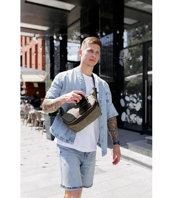 Сумка бананка для фотоапарата шкіра та канвас TARWA RCh-1313-4lx. Забудьте свою стару поліпропіленову сумку для фотоапарата. Тепер всі ваші аксесуари поміщаються в стильну шкіряну бананку або сумку крос-боді з канвас (парусини) та шкіри крейзі хорс