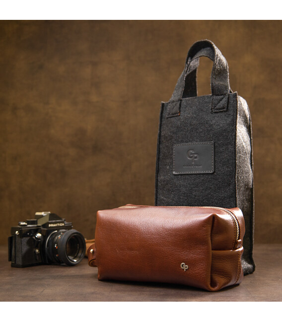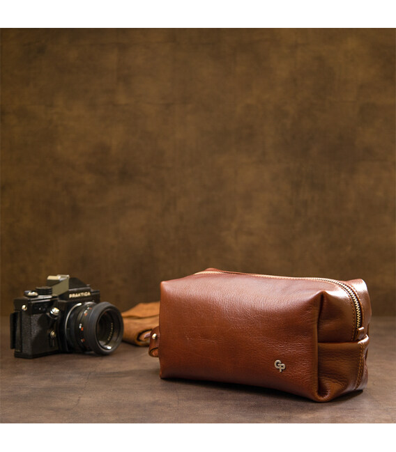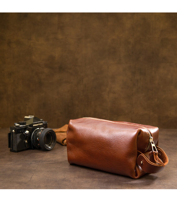 Добротна чоловіча косметичка з високоякісної натуральної шкіри в гарному насиченому коричневому кольорі. Має компактні розміри, але при цьому дуже містка і функціональна. Така косметичка може стати незамінним аксесуаром в поїздці або просто в повсякденному використанні. Також вона може стати незабутнім подарунком для близької людини.