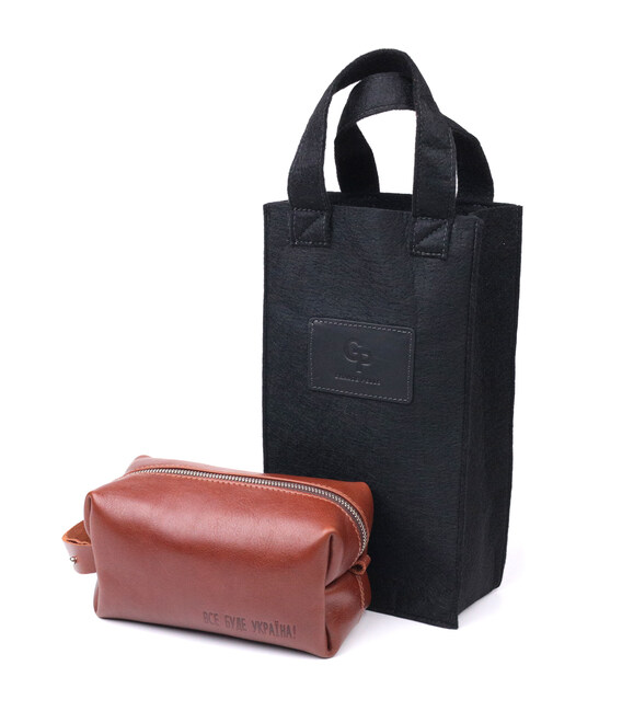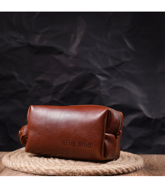 Місткий чоловічий несесер, середнього розміру в гарній гладкій шкірі, з патріотичним тисненням на лицьовій стороні “Все буде Україна”. Має просторе відділення, в яке помістяться всі необхідні речі. Надійна фурнітура представлена у срібному кольорі. Для зручного перенесення аксесуарів є спеціальна ручка на бічній стінці. Запакована ця косметичка в красиву сумку фетрову. Вироби зі шкіри – чудова ідея подарунка на будь-які свята.